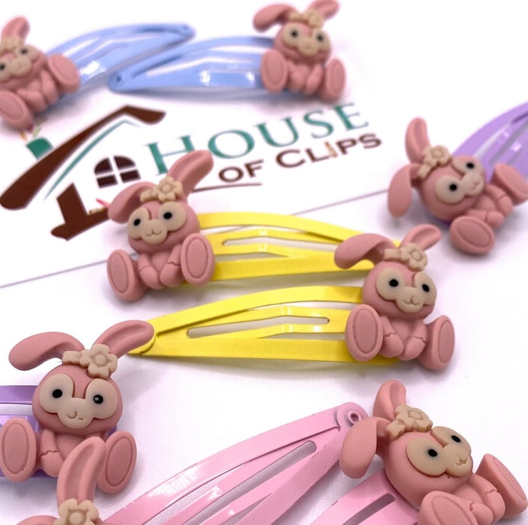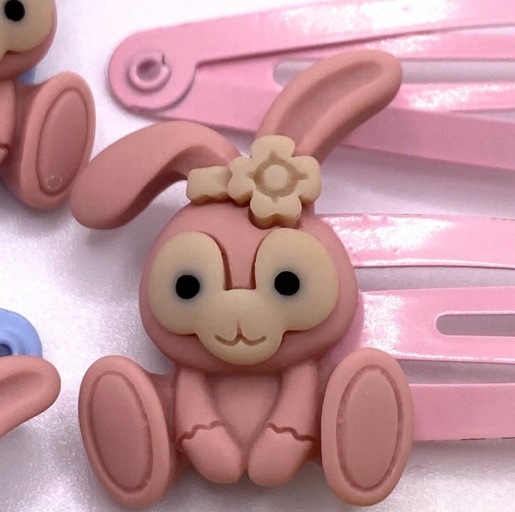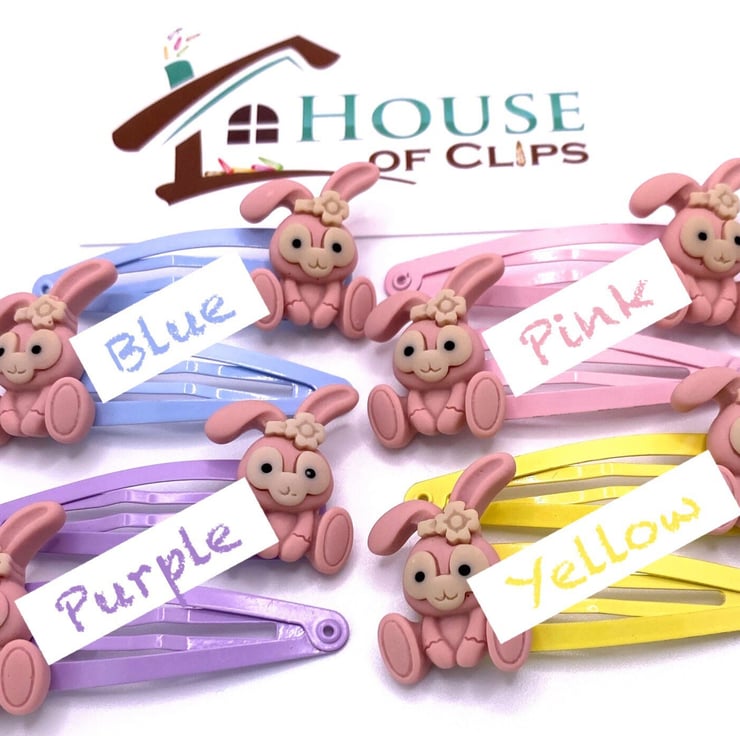 Dusky pink bunnies sit upon pastel coloured hair clips. Choose from pastel; blue, purple, pink and yellow.