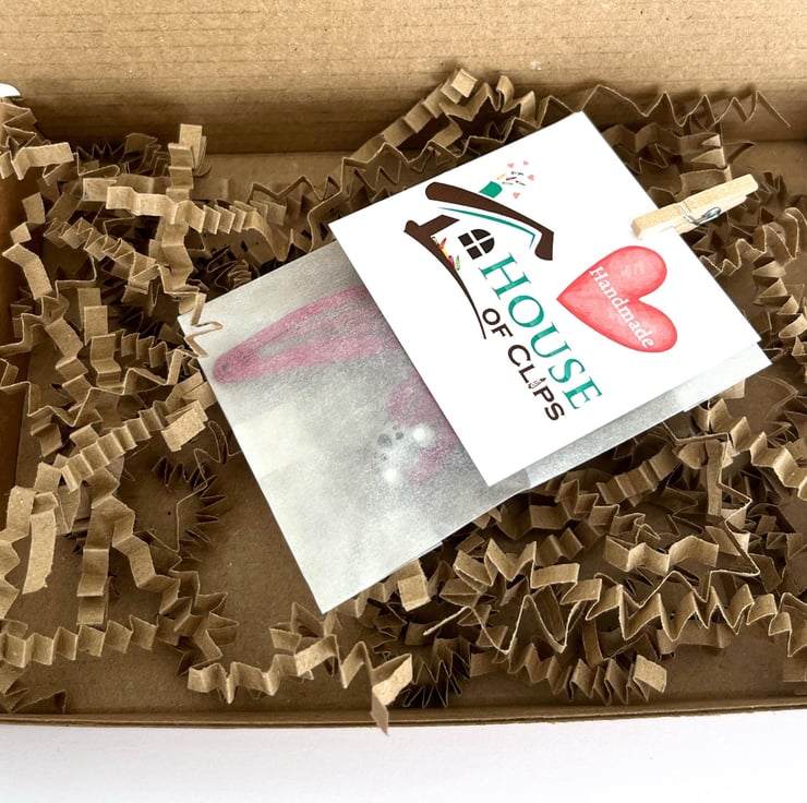All of my clips arrive in a eco-friendly cellophane bag, decorated with a peg and business card, sealed with a House of Clips sticker. The hair clips are placed into a Kraft letterbox nestled in lavender scented shredded paper (please message me if you do not want the lavender scent). Receipts included unless a gift receipt is required