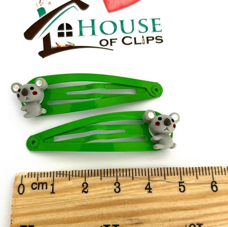 These clips measure 5.cm in length on the hair clip and the actual koala is 1 cm tall.