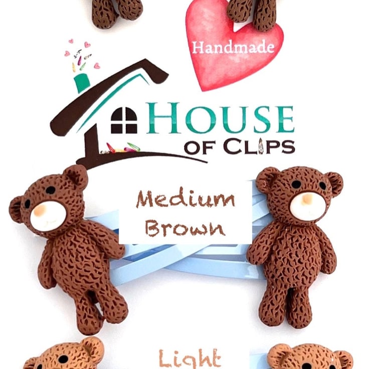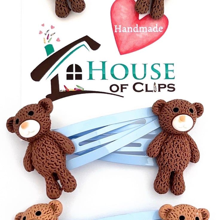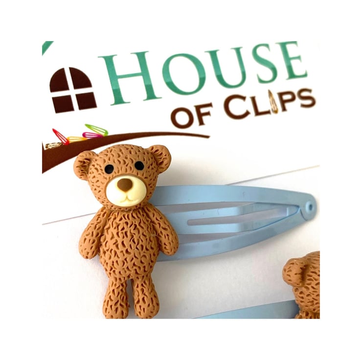 These clips measure 5cm in length and the bear is 3 cm in height. These fun hair clips arrive beautifully packaged in a Kraft box cushioned in lavender scented shredded paper. The clips themselves are resting in a eco-friendly glassine envelope sealed with a House of Clips sticker.