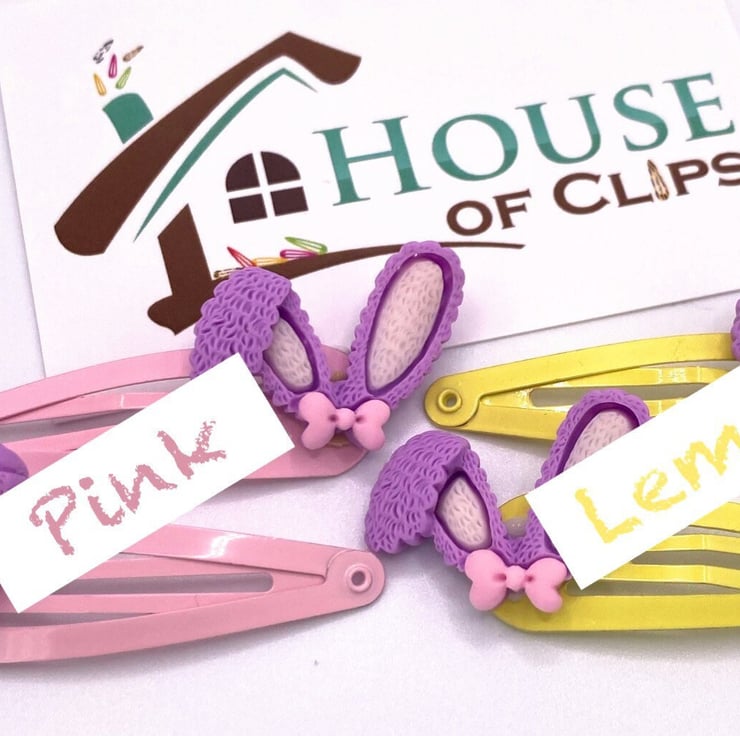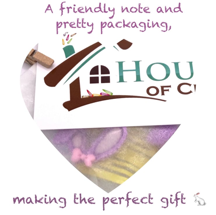 The fuzzy eared bunny hair clips arrive in a pretty eco-friendly glassine bag, decorated with a peg and business card. All placed into a Kraft box nestled in lavender scented shredded paper. Making your parcel something to smile about when it drops through your letter box!