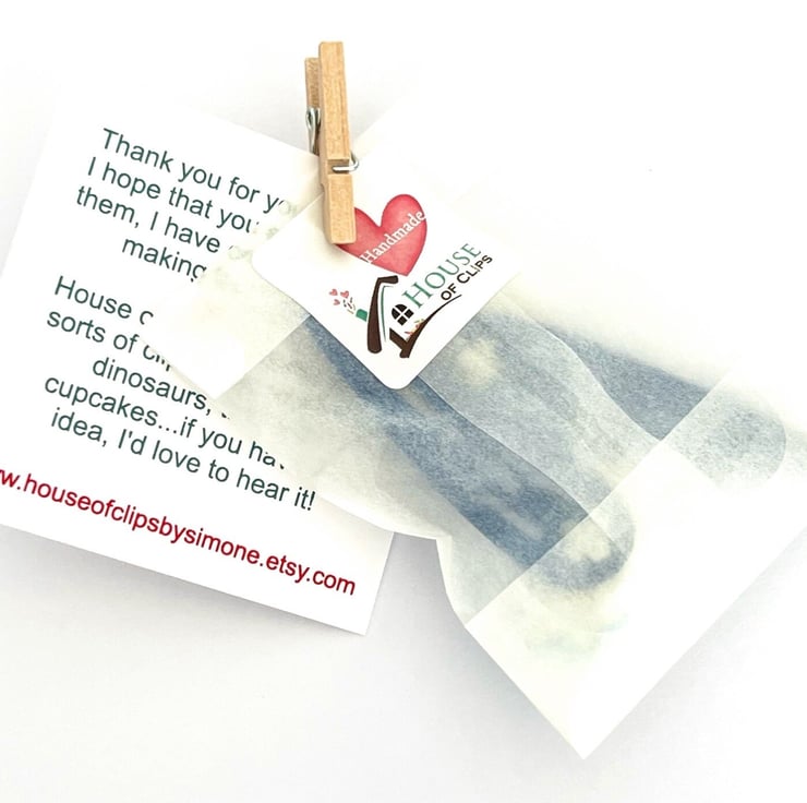 All of my clips arrive in a eco-friendly glassine bag, decorated with a peg and business card, sealed with a House of Clips sticker. The hair clips are placed into a Kraft letterbox nestled in lavender scented shredded paper (please message me if you do not want the lavender scent). Receipts included unless a gift receipt is required