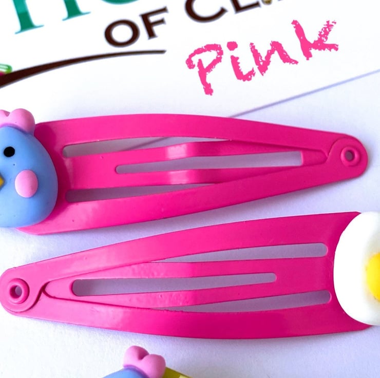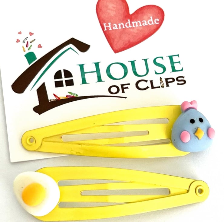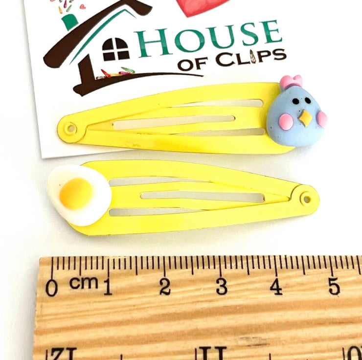 The clips measure 5cm in length as pictured and the colour choices are pink or yellow. However, if you would like the chick and egg set on a different colour hair clip, look at the colour chart and simply message me with your order.