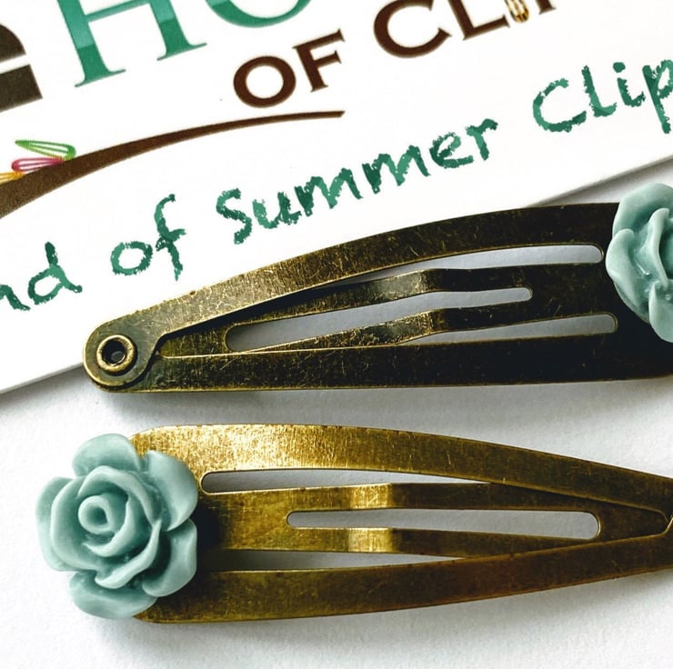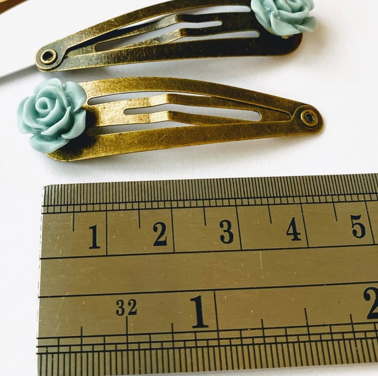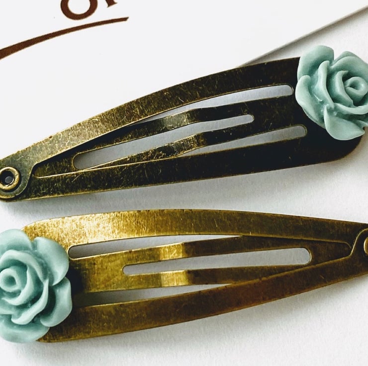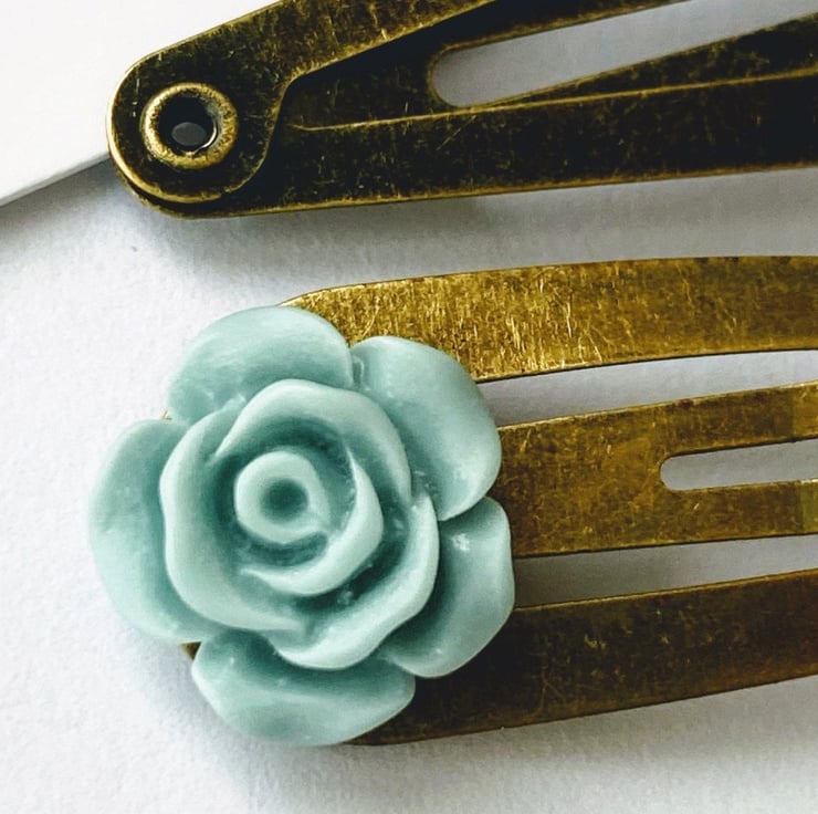 Beautiful Rose Clips. The roses are very detailed and are an egg shell blue colour. I have set them on brushed antique gold hair clips but if you would like a different coloured hair clip then simply look at the colour chart and message me with your order.
