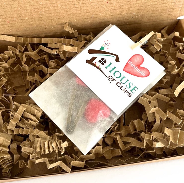 All of my clips arrive in a eco-friendly glassine bag, decorated with a peg and business card, sealed with a House of Clips sticker. The hair clips are placed into a Kraft letterbox nestled in lavender scented shredded paper (please message me if you do not want the lavender scent). Receipts included unless a gift receipt is required.