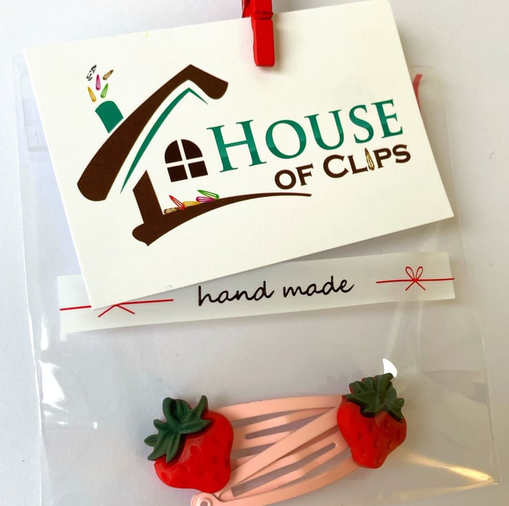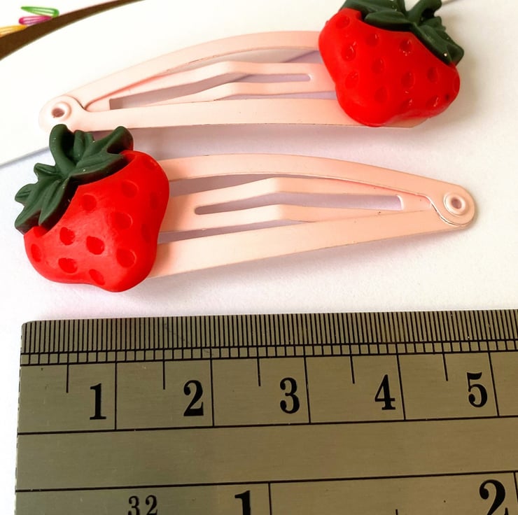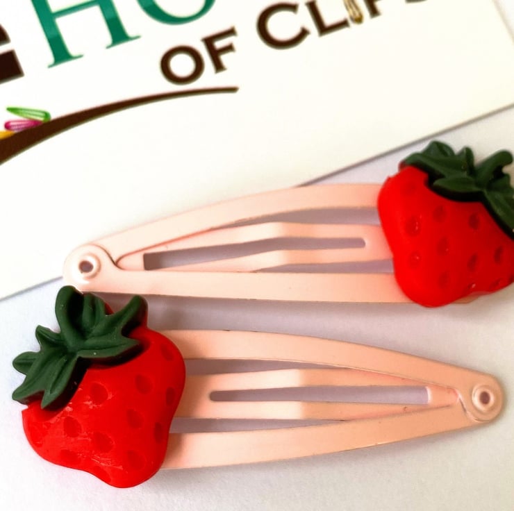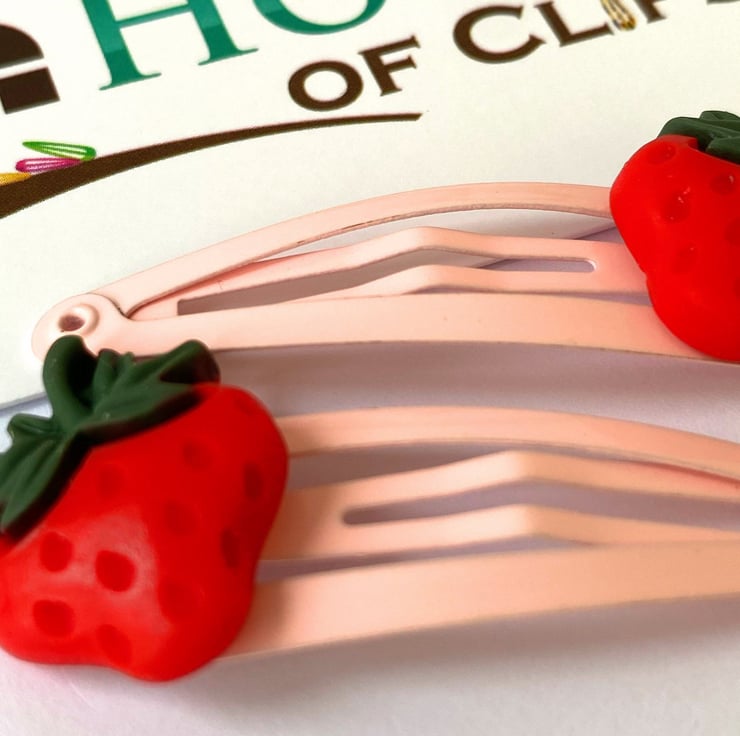 These strawberry hair slides are currently set on pink snap clips, however if you would like a different coloured snap clip then simply look at the colour chart and message me with your order.