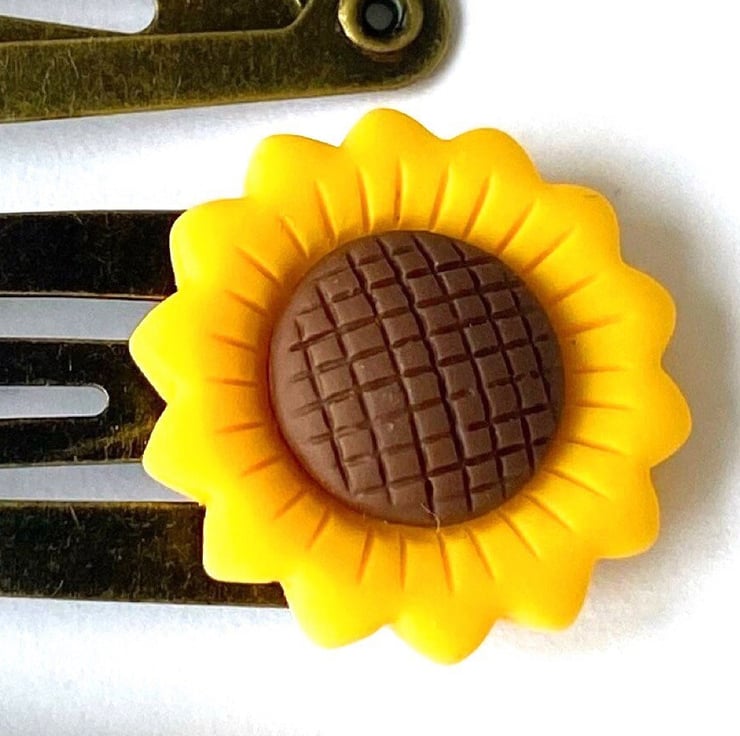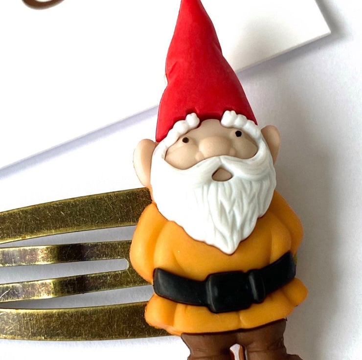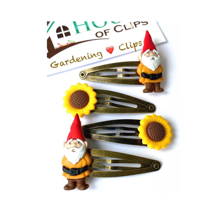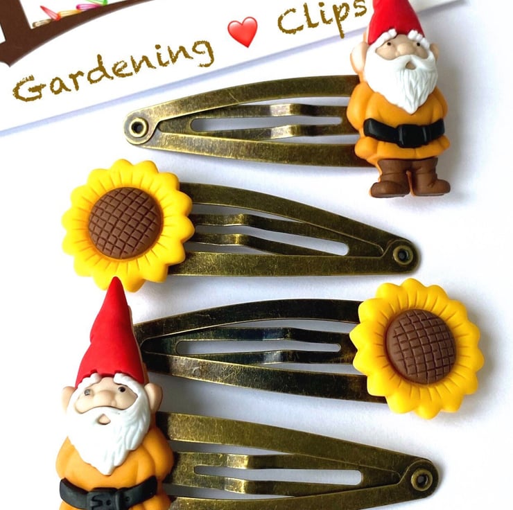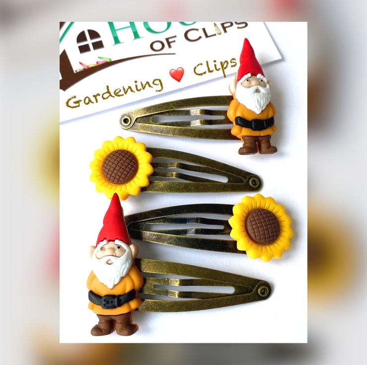 You receive 2x sunflower clips and 2x gnome clips all set on antique gold hair clips. However if you would like the flowers and gnomes set on a different coloured clip (or even every clip being a different colour) then simply look at the colour chart and message me with your order.
