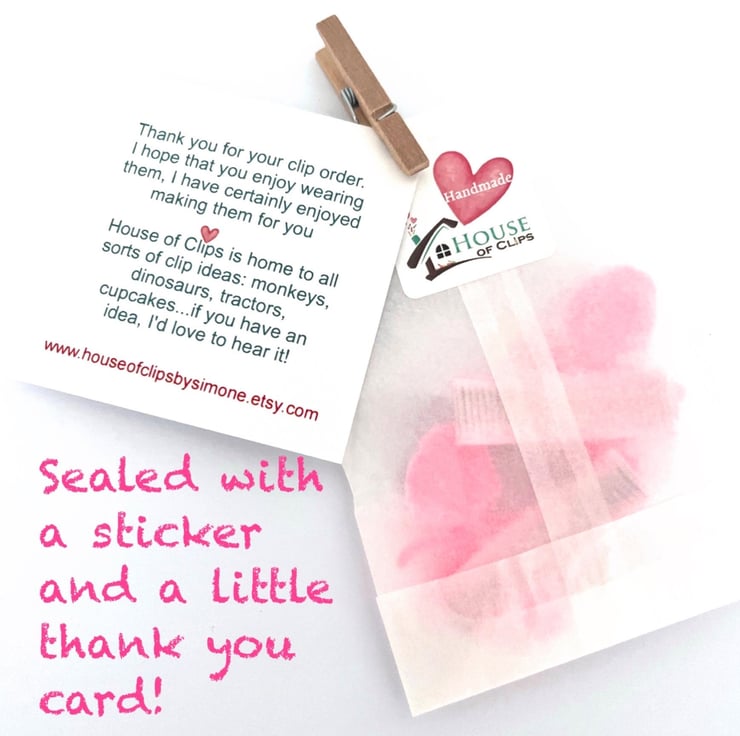 All of my ballet hair clips arrive in a Eco-friendly glassine bag, sealed with a House of Clips sticker and pegged with a thank you card.