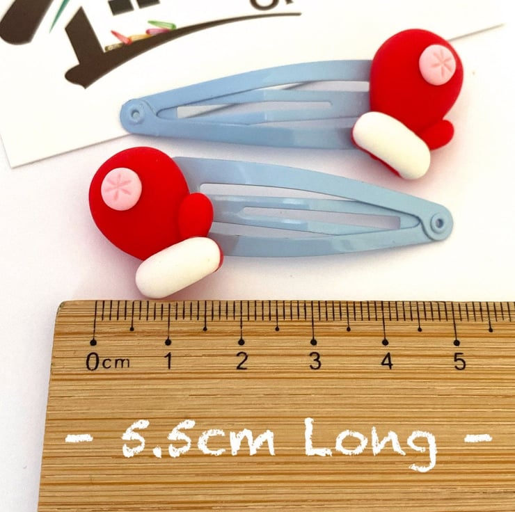 These rather wonderful Christmas Mitten hair clips measure 5.5 cm in length. They make a great stocking filler or little Xmas gift for niece, daughter, granddaughter and not forgetting the boys too!