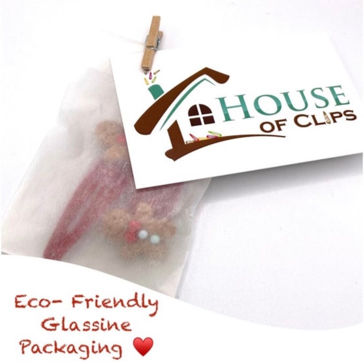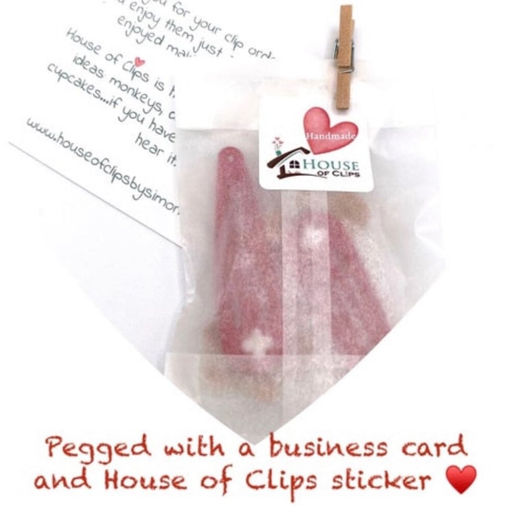 All of my clips arrive in a eco-friendly glassine bag, decorated with a peg and business card al placed into a brightly coloured metallic protective envelope.