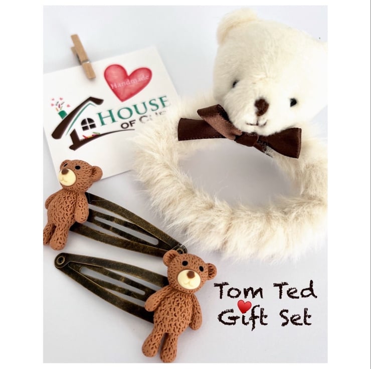 Tom Ted Gift Set - Gift Under 10 Pounds - Teddy Bear Antique Style - Gift For Niece Granddaughter Daughter -Fun Handmade Hair Clips For Kids