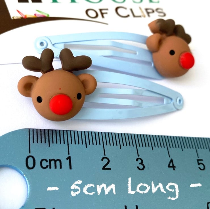 These extremely cute Rudolph the Red Nose Reindeer hair clips measure 5cm in length. They make a great stocking filler or little Xmas gift for niece, daughter, granddaughter and not forgetting the boys too!
