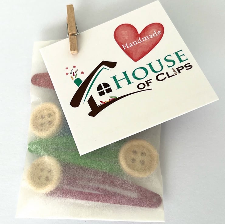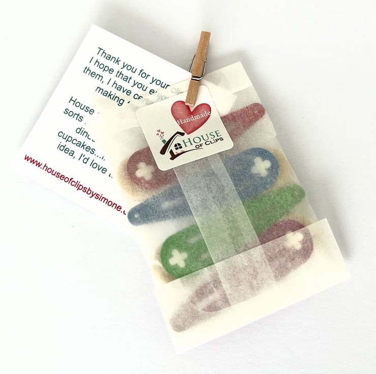 All of my clips arrive in a eco-friendly glassine bag, decorated with a peg and business card, sealed with a House of Clips sticker. The hair clips are placed into a Kraft letterbox nestled in lavender scented shredded paper (please message me if you do not want the lavender scent). Receipts included unless a gift receipt is required.