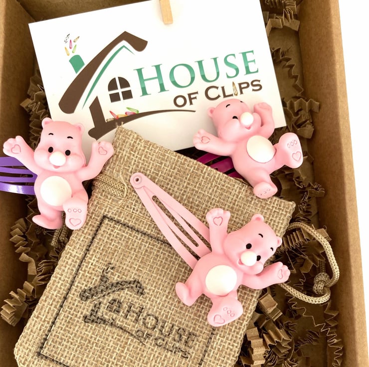 These pink bear snap clips arrive in a small postal box with lavender scented shredded purple paper, making them a real treat to receive. All topped with house of clips stickers and card.