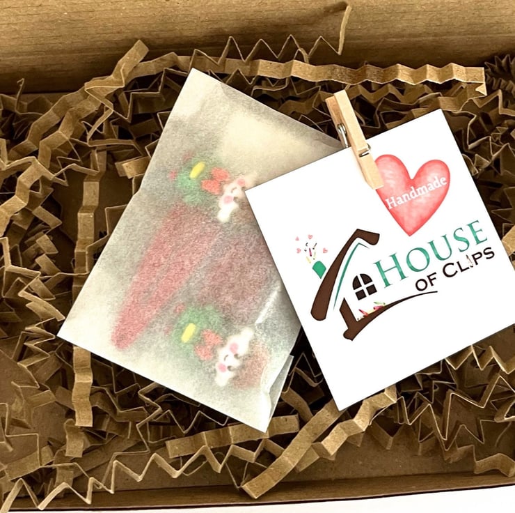 The clips arrive in a glassine bag with a house of Clips card attached by a tiny peg. The clips are nestled in lavender scented shredded paper and protected inside a Kraft postal box.