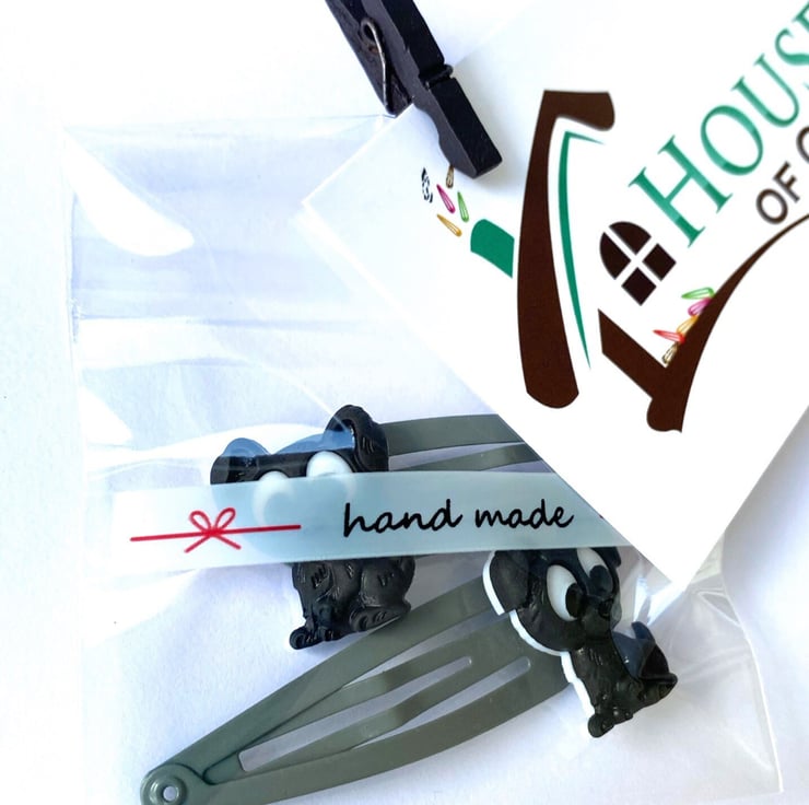 Otis the Dog hair clips arrive in a cellophane bag, decorated with a peg and business card all placed into a metallic protective envelope.