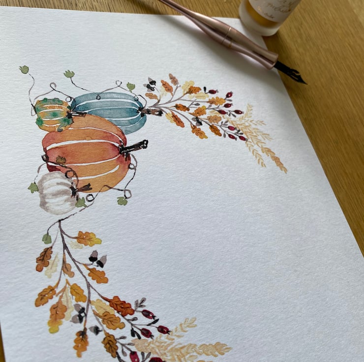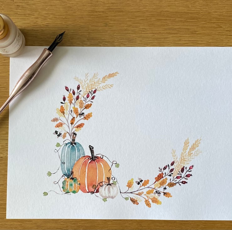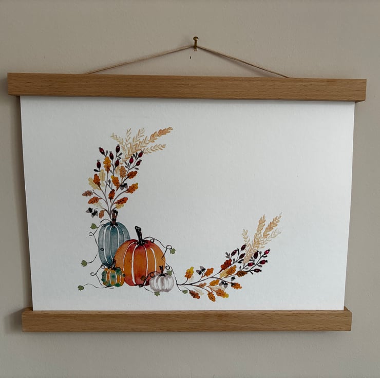 Celebrate the beauty of autumn with this stunning A4 watercolour print featuring a personalised pumpkin wreath. Hand-painted by me and then printed on eco-friendly, recycled paper by a small UK business. This print can be customised with any text and colour, including a metallic finish. Perfect for autumn lovers, this seasonal décor suits kitchens, hallways, or as a unique gift. A previous customer had this personalised with their surname, which means pumpkin or pumpkin seller in Italian! Personalised quotes or names add a special touch. Hand-customised in 1-2 weeks, with rush orders available upon request!