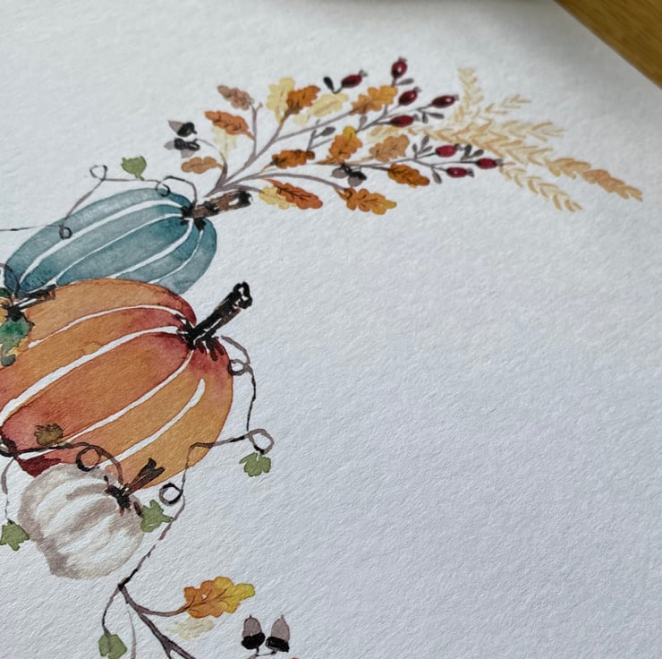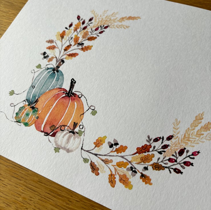 Personalised Autumn Pumpkin Wreath Watercolour Print - Eco-Friendly A4 Art - Cu