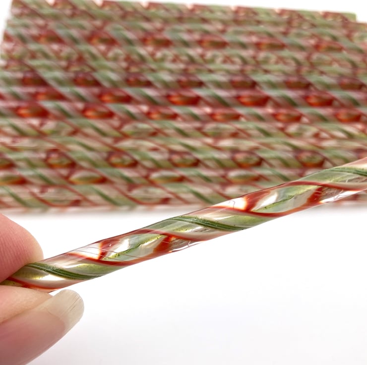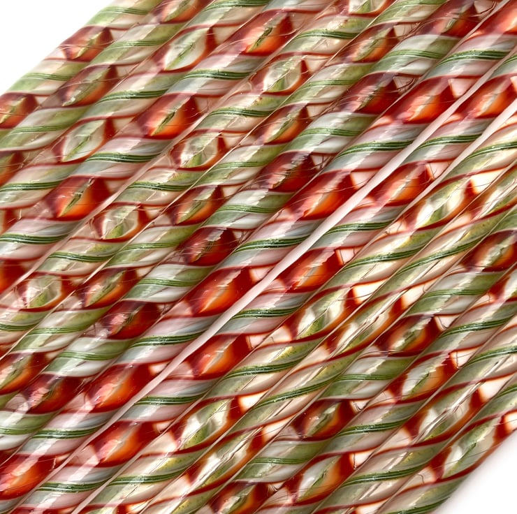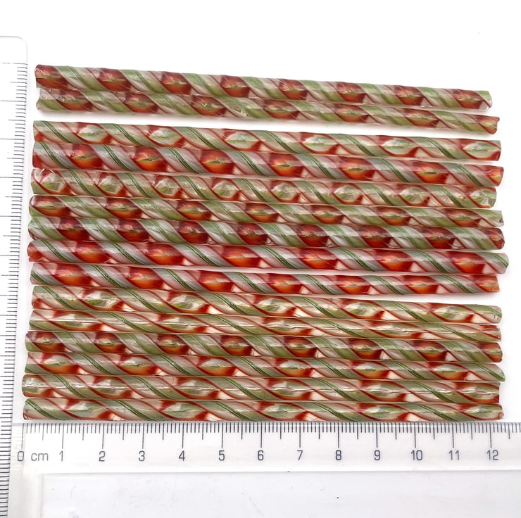 Christmas pack of twisty cane in red, white and green lacy stripes pattern. 12-15 pieces of approx 12cm lengths in each pack.