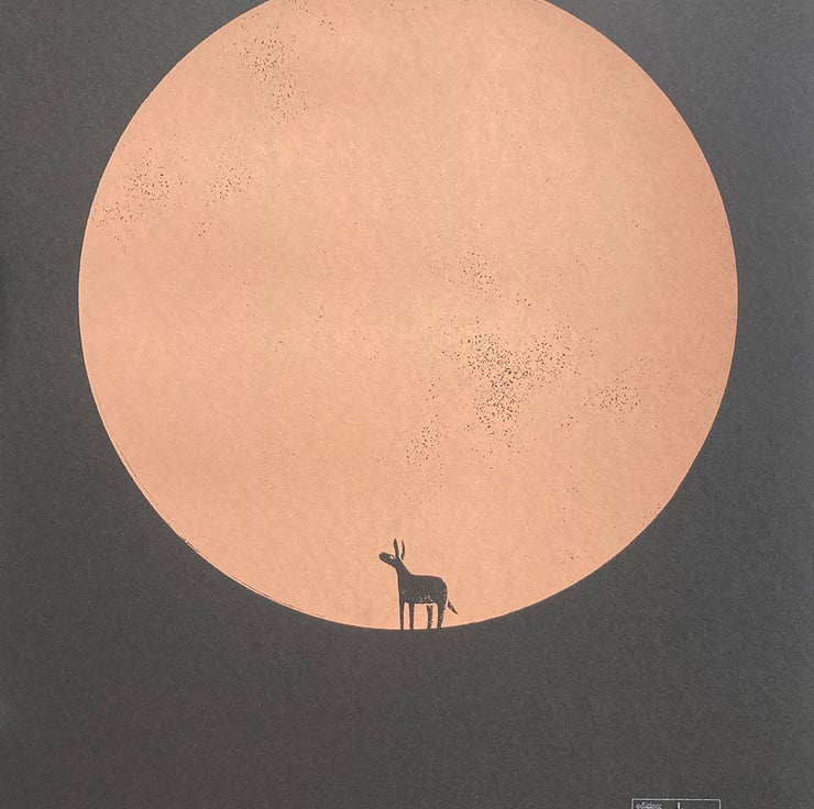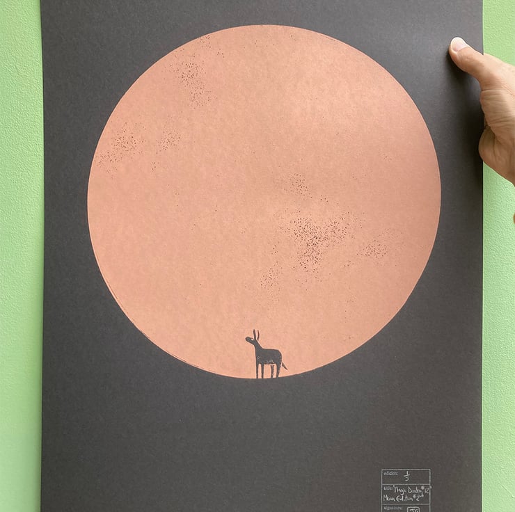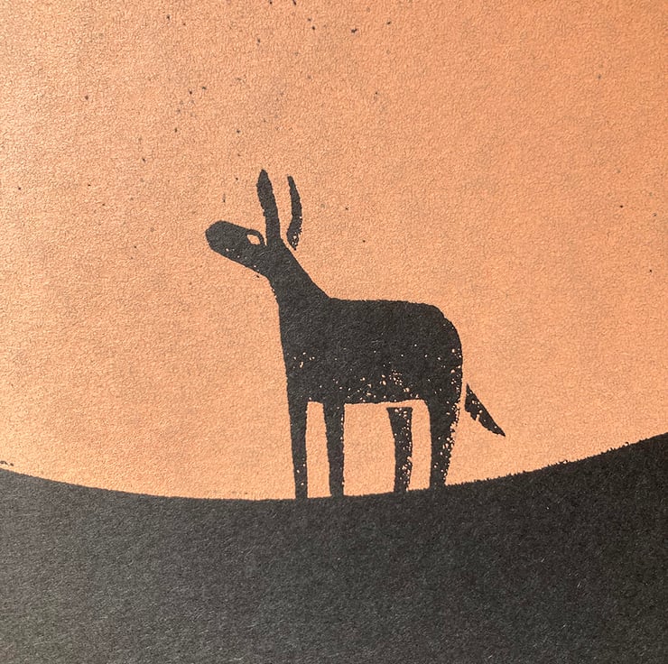 This is the twelfth print in the 'magic donkey' series, a continuation of my donkey dreamworld theme. I've always had a fascination with circles, using them in my prints regularly, and on this occasion it is the ultimate minimalist tribute! The donkey stands before a mighty circle. Is it a moon, a solid dot, a passage to another place? They will find out soon enough..