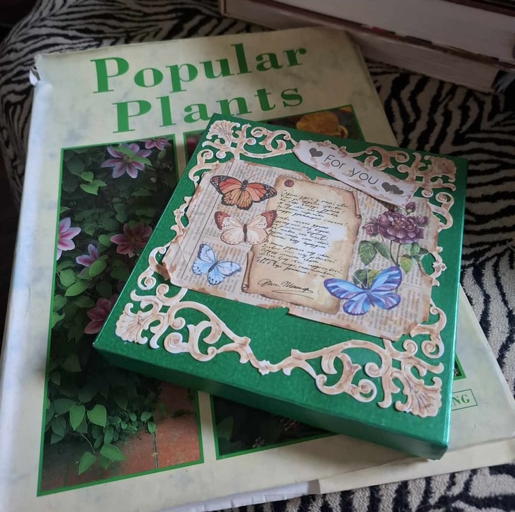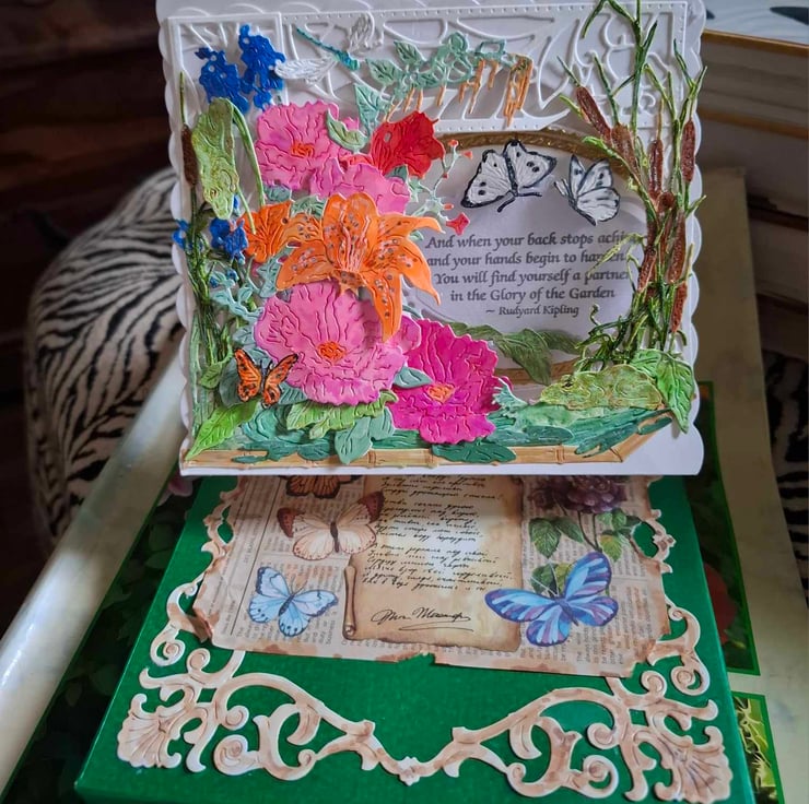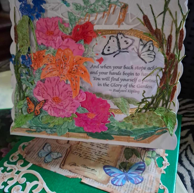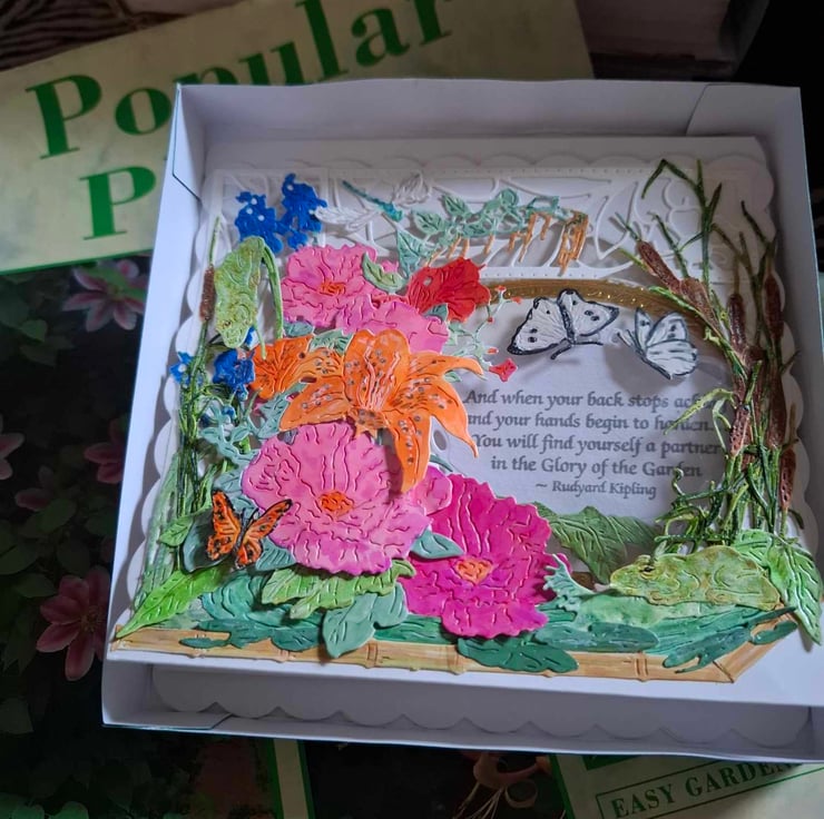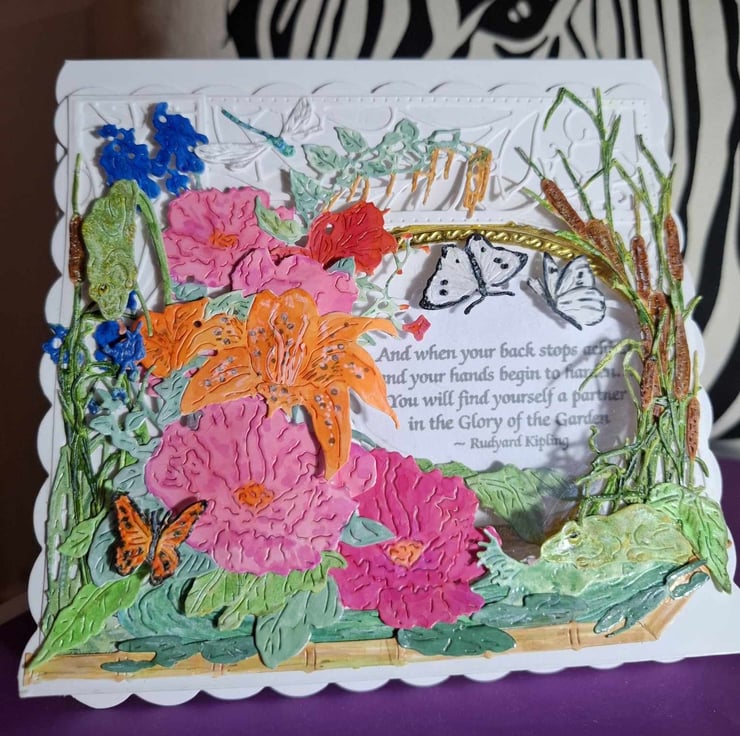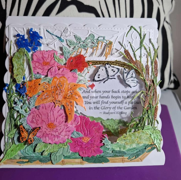 An Exquisite Crafted Hand Painted Decoupage Tent No Verse/Blank Interior Card For Any Occasion With Unique Designs And Each Lovingly Created For That Special Someone. This Delightful and Whimsical Peek-A-Through Card Entitled The Secret Nature Gardener Depicts A Beautiful Scene Of A Secret Corner Though Full Of Lovely Flowers Has Been Sympathetically Left To Welcome Nature In, Which can Be See If You Look Has Already Started To Visit The Fluttering Butterflies And Dragonflies Are Easy To See But Can You See The Frogs Hiding In The Foliage Watching The Gardner As He Toils Amongst The Flowers, The 3D Effect Gives This Card A Depth And Perspective Of Realism To The Fact You Could Almost Hear The Frogs Singing and The Hum Of The Dragonfly Wings Forgetting It Is All Only Card. Each Card Is Crafted With Intricate Detail For A Delight To Treasure And Will Be Shown With A Decorated Box Or Cardelope Where Applicable Also Prices Reflect The Hours Of Crafting This Unique Card And Quality Of Materials Used.