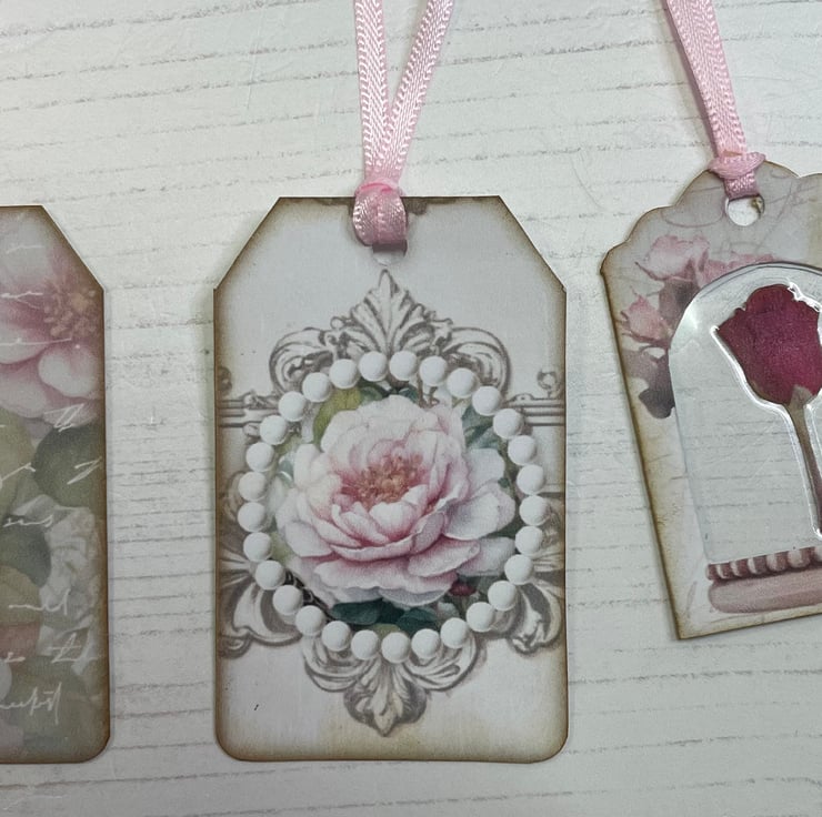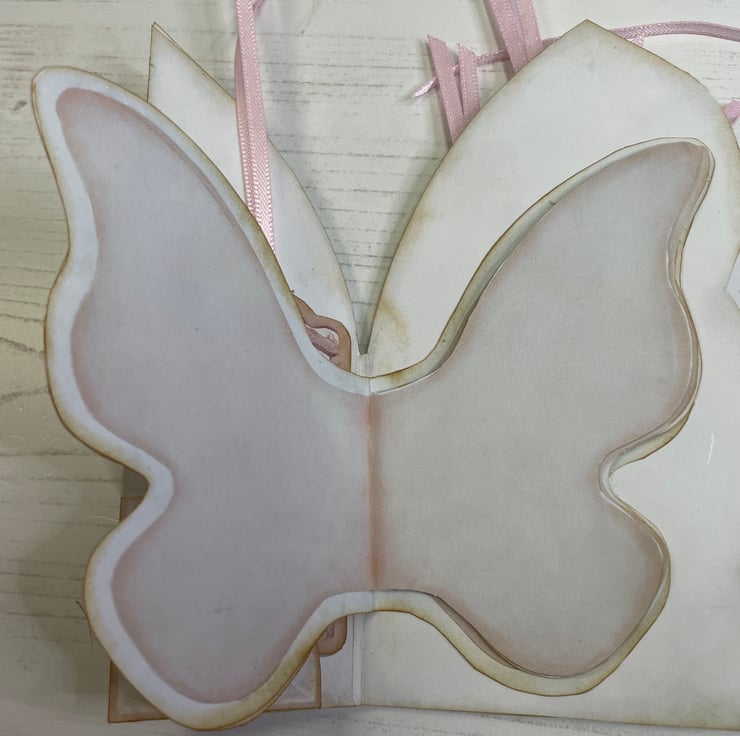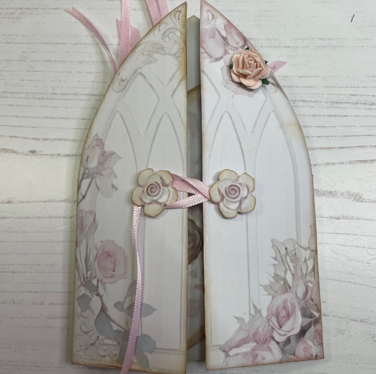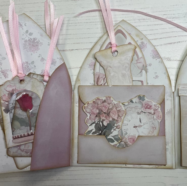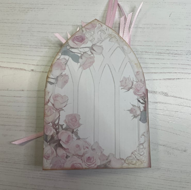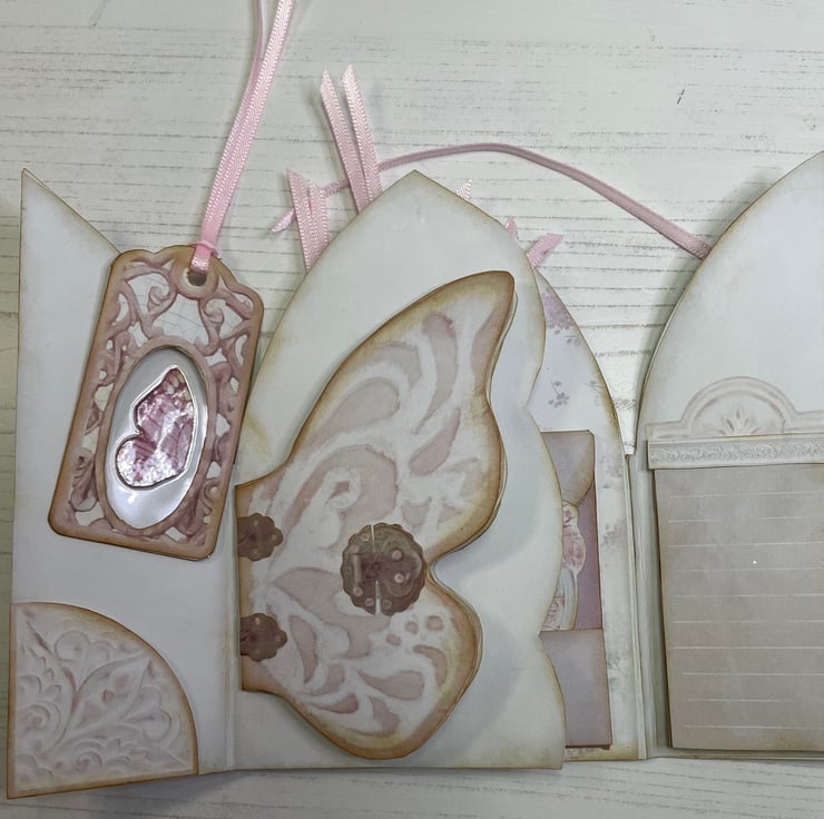 Beautiful faded rose arch folio with pockets, tags, butterfly notebook and mini jotter. Two of the tags are specimen style with butterfly wings and rose image laminated. Decorated with a pink rose and pink ribbon. Measures 5.5” x 3.75”