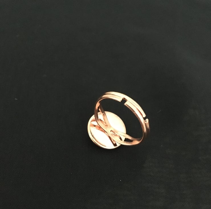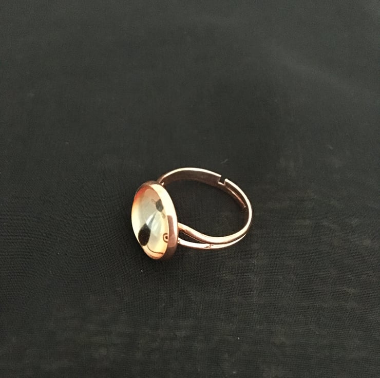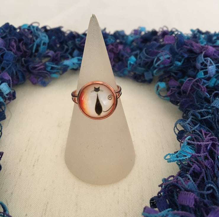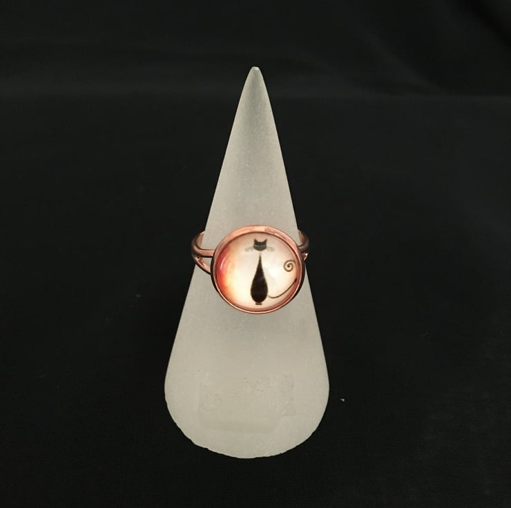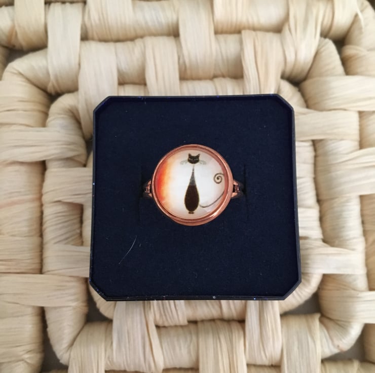 Abstract, fun cat ring in a copper tone setting. The ring is set with a printed design covered by a glass dome and measures 12mm across the centre.