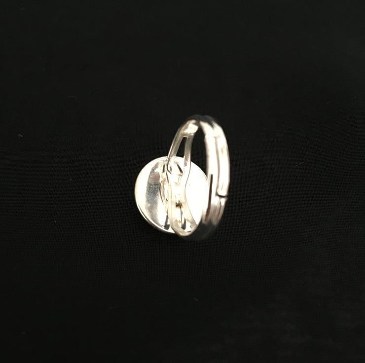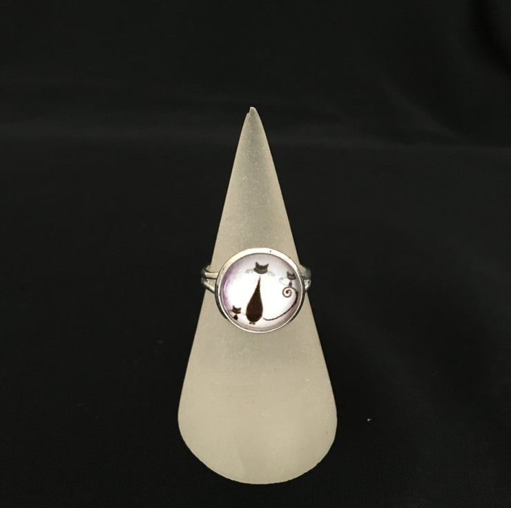 Abstract, fun cat ring in a silver tone setting. The ring is set with a printed design covered by a glass dome and measures 12mm across the centre.