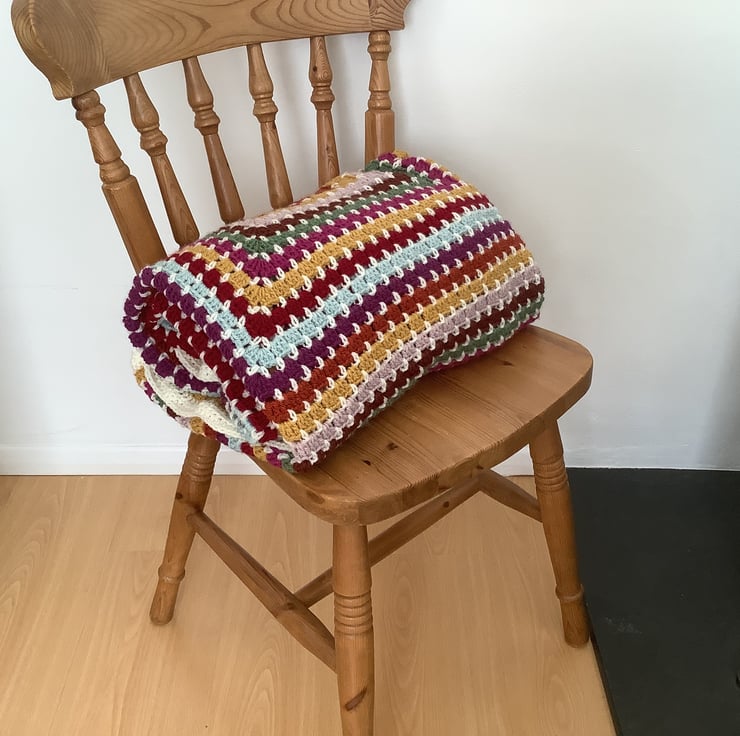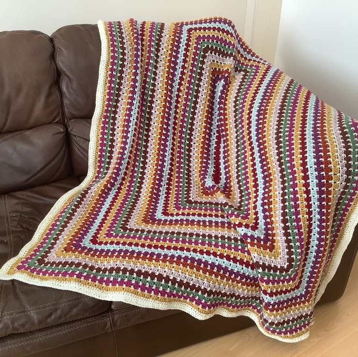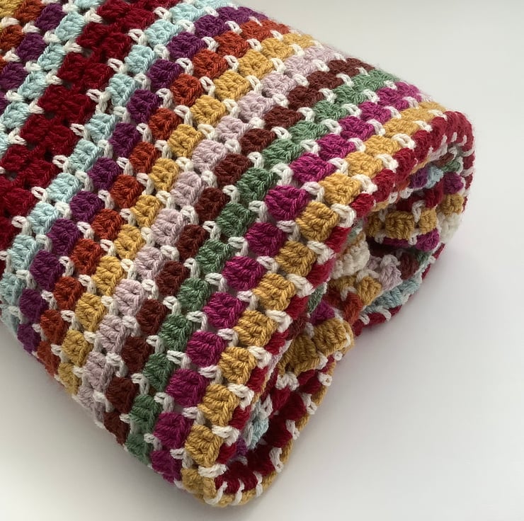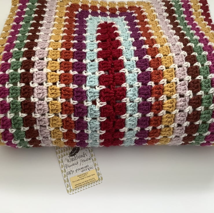 I have designed and crocheted this lovely vintage -inspired blanket ' Woodlands 'in a lovely Autumn leaf colour scheme. . A block stitch design worked as a large rectangle gives a neat brickwork effect .