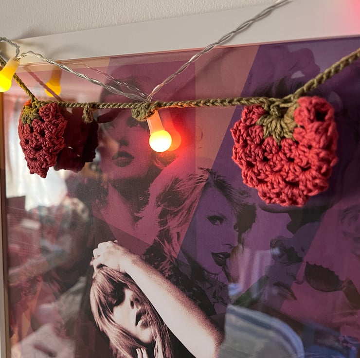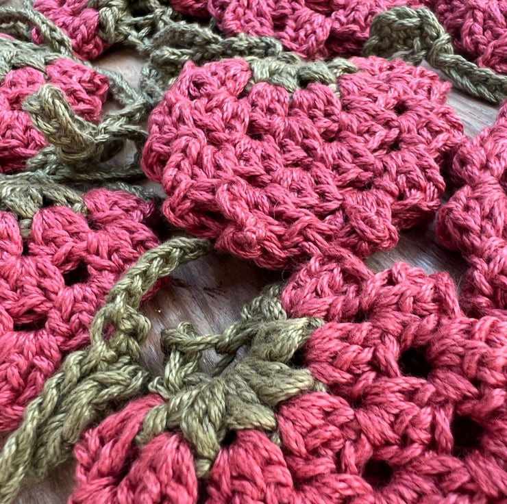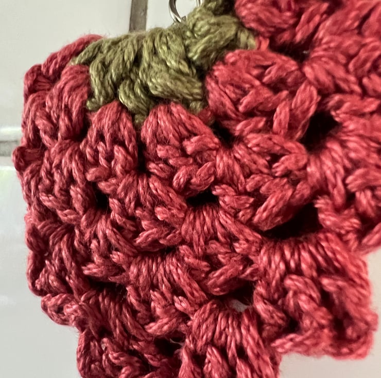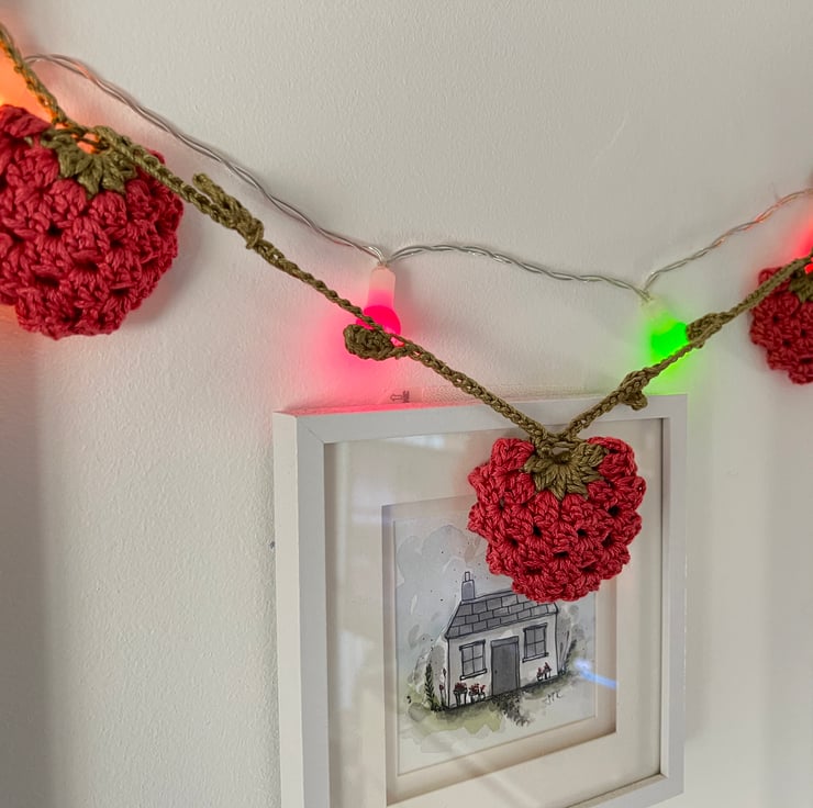 Handmade in Dorset, with nine crochet raspberries joined with crochet stem & leaves. Each raspberry measures 6cm x 7cm x 1cm, the full length of the bunting is 185cm long