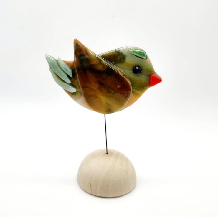 "Beautiful handmade fused glass bird resting on a natural wooden half sphere. This unique piece is crafted by hand, with the bird shape cut out of decorative glass and adorned with intricate elements using frit. A one-of-a-kind addition to any home decor or collection.