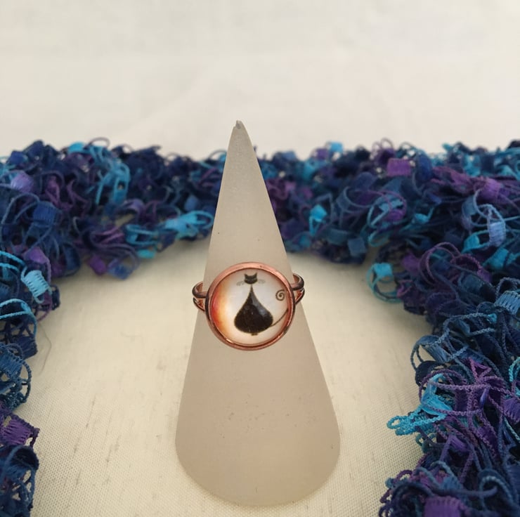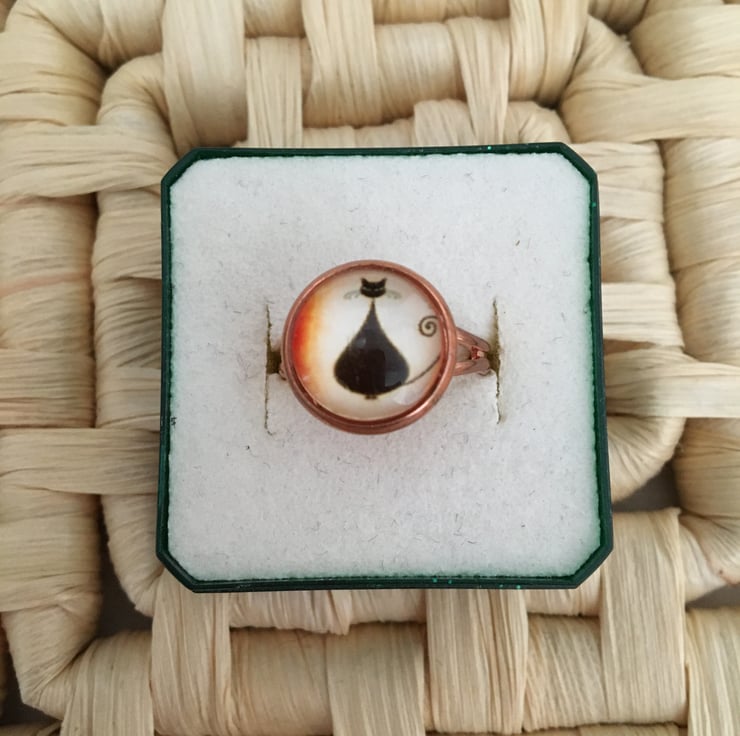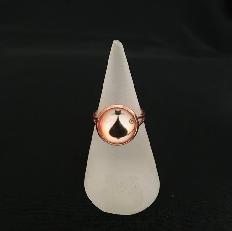 Abstract, fun cat ring in a copper tone setting. The ring is set with a printed design covered by a glass dome and measures 12mm across the centre.