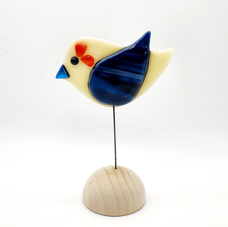 Beautiful handmade fused glass bird resting on a natural wooden half sphere. This unique piece is crafted by hand, with the bird shape cut out of decorative glass and adorned with intricate elements using frit. A one-of-a-kind addition to any home decor or collection.