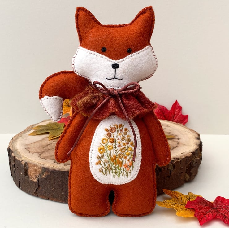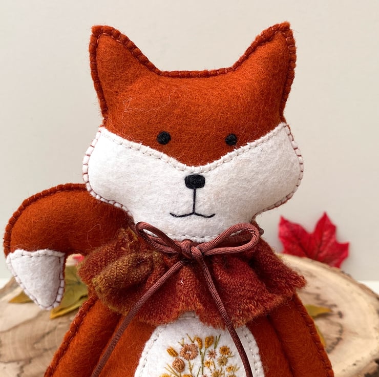 A hand sewn and embroidered woodland felt fox designed to stand or hang, a decorative keepsake gift or collectable.