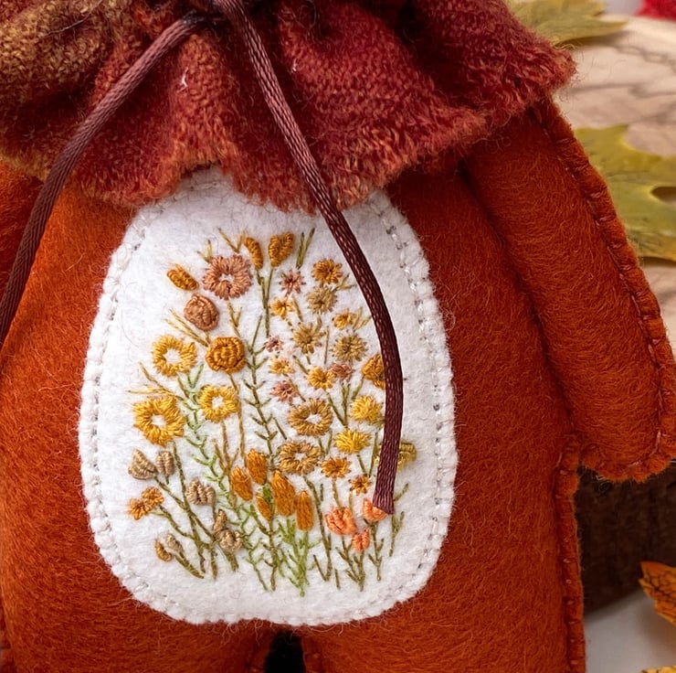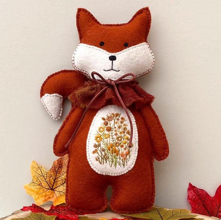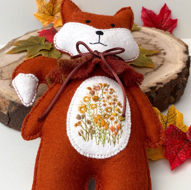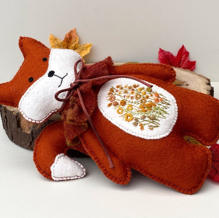 Designed as a decorative embroidered keepsake he was sewn from 100% wool felt in deep cinnamon, a lovely rich fox colour with snow white contrast to his body. Hand embroidered with floral details in colours to compliment and match, terracotta, paprika, deep oranges, golds and greens.