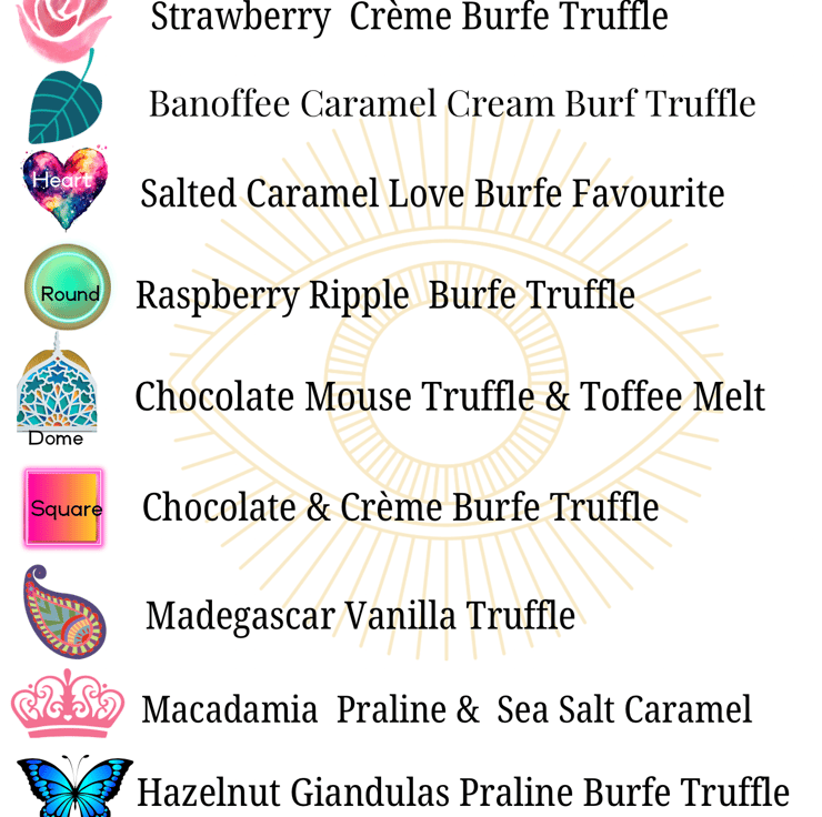 Made from the finest quality luxary Ingredients - Belgium Chocolate and rich buttery Creamy Burfe Truffles which has the a soft silky texture, decorated with coloured cocoa butter. Colouful and Pretty, Classy, Contemporary and Delicious Melt in the mouth leaving marvellous taste your tastebuds will remember as heavenly and divine. Unique Designs are created weekly so your box may vary slightly from the image in the picture. The menu is designed by shape which is attached in the images.