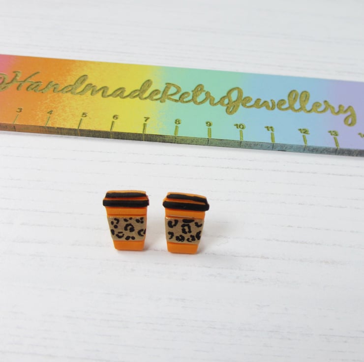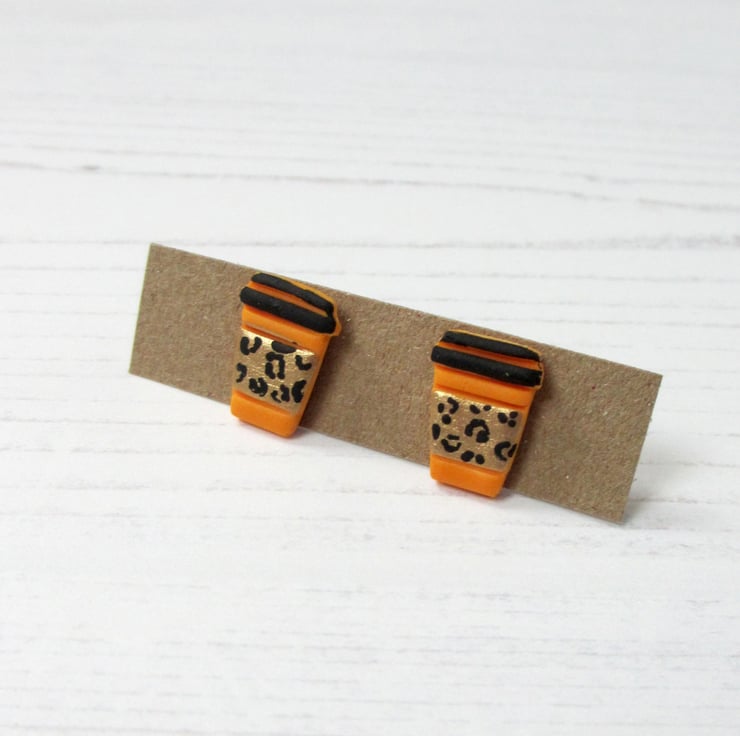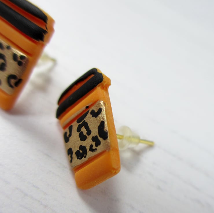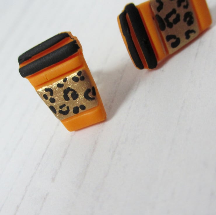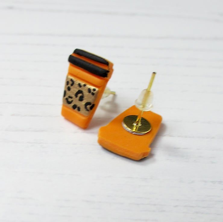 These mini coffee cup earrings have been carefully hand crafted using polymer clay, cut in the shape of teeny tiny travel cups. They have a hand painted lid and black leopard print design in the middle. Sealed with a gloss to protect.