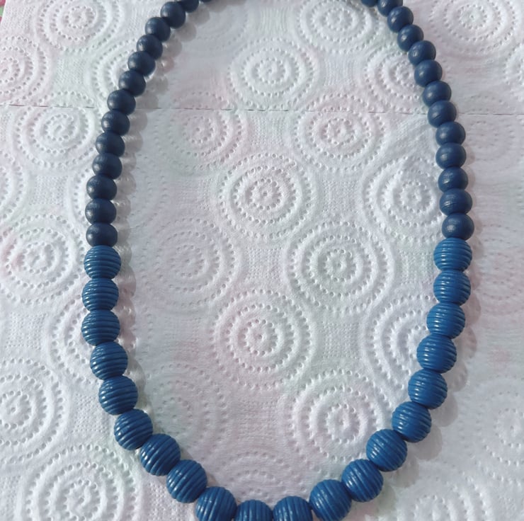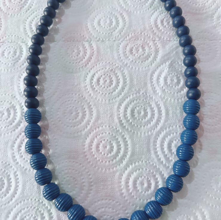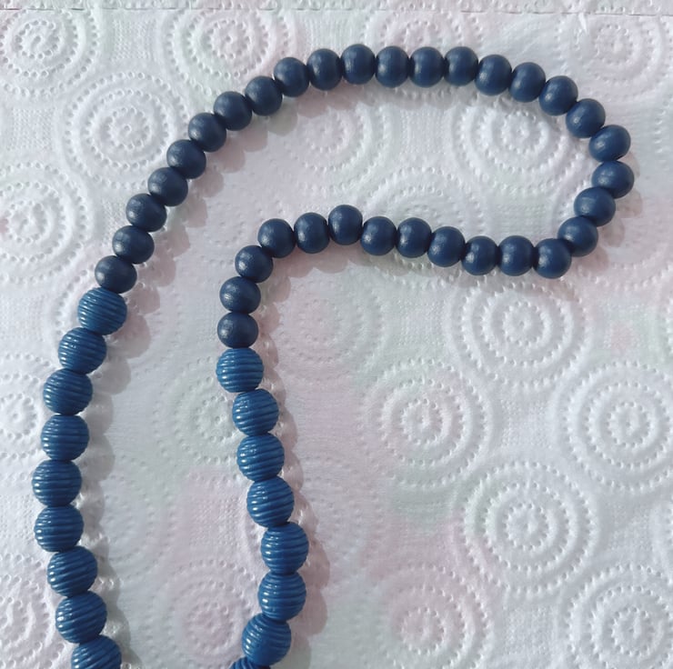 This necklace features Plain and Beehive Dark Marine Blue wooden beads strung on a durable elastic cord. This elastic cord allows the necklace to be worn comfortably over the head without the need for a clasp or closure. It also ensures a flexible fit that can accommodate various neck sizes.