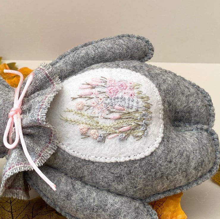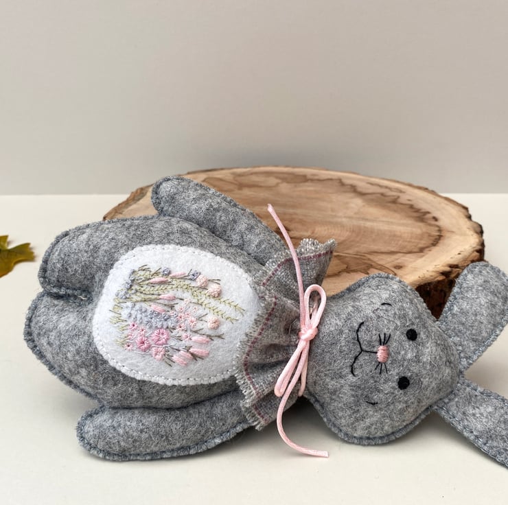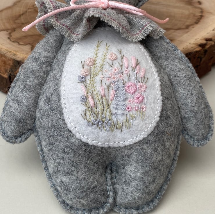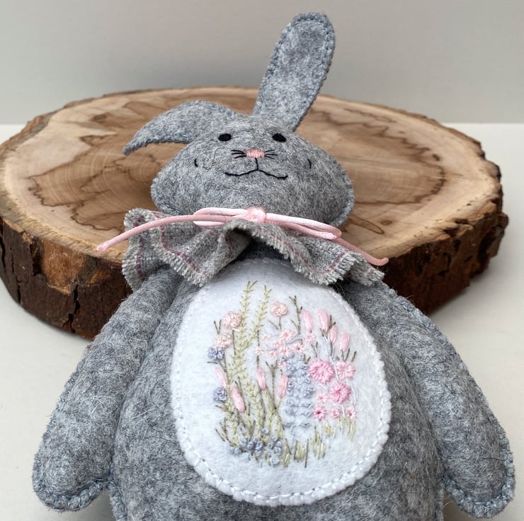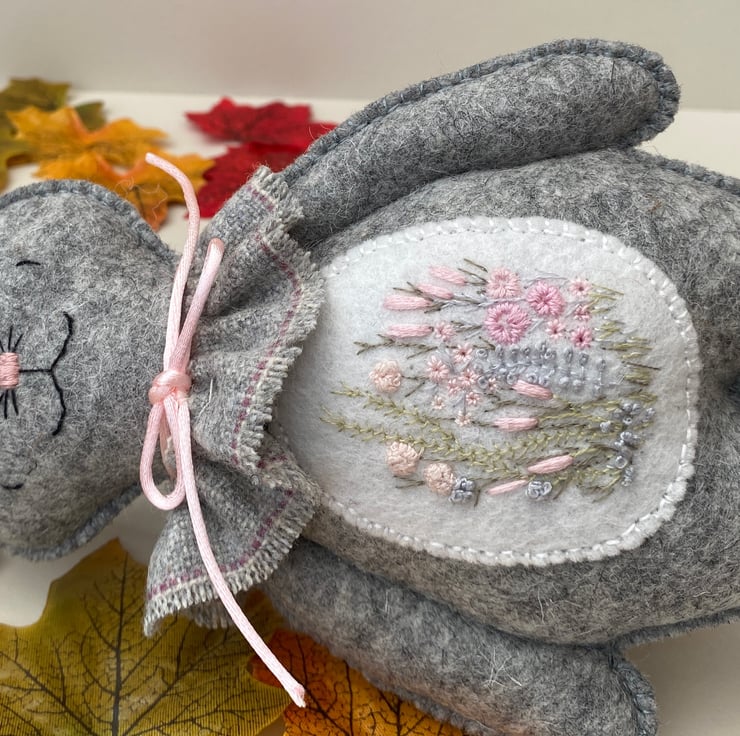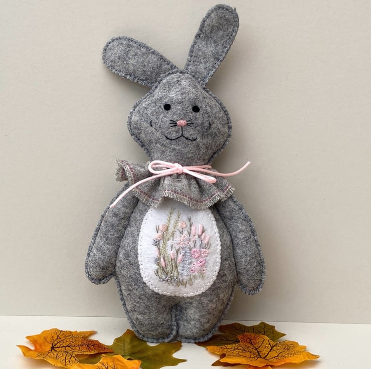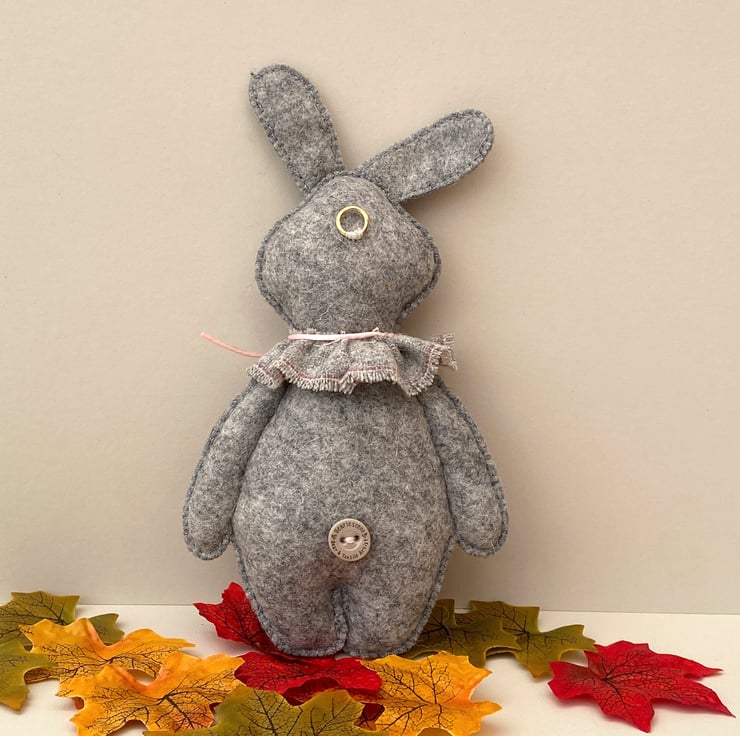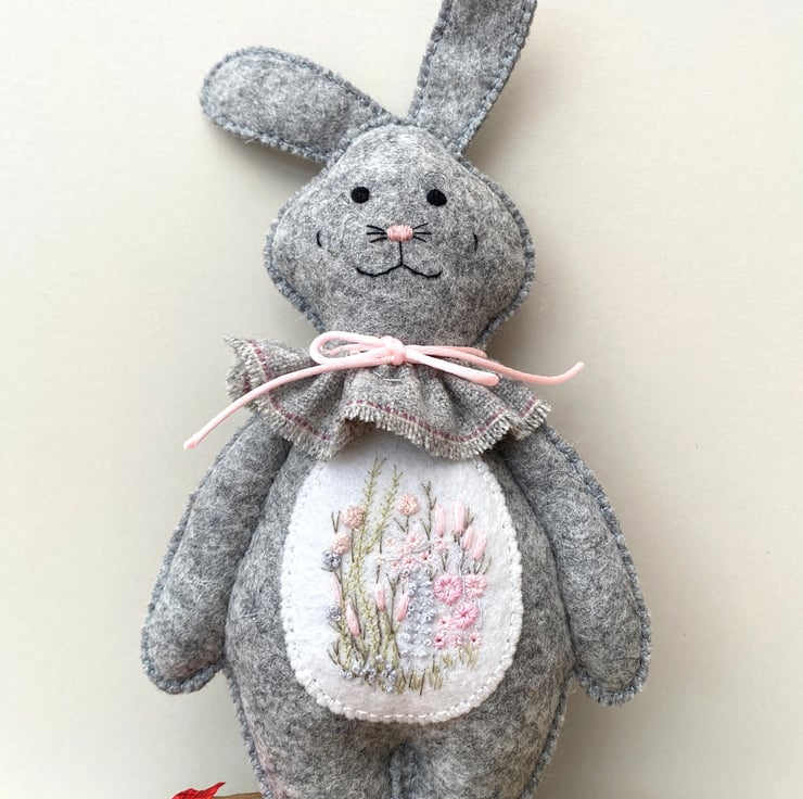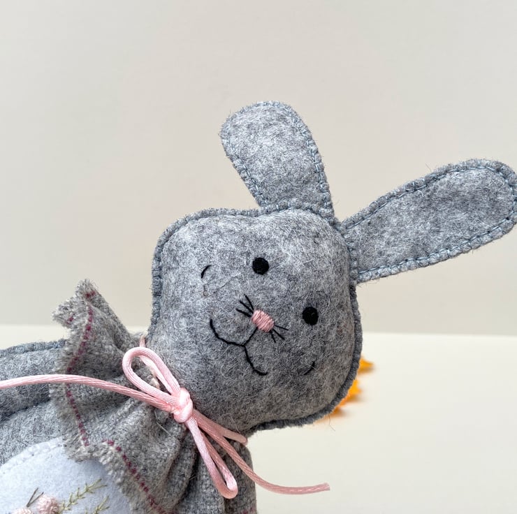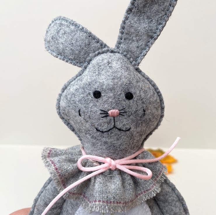 Bunny has been finished with a neck ruffle made from wool fabric in light grey and finished with a satin rolled ribbon in light pink.