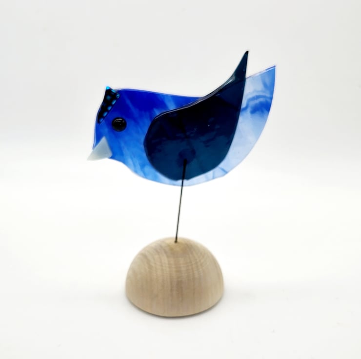 Beautiful handmade fused glass bird resting on a natural wooden half sphere. This unique piece is crafted by hand, with the bird shape cut out of decorative glass and adorned with intricate elements using frit. A one-of-a-kind addition to any home decor or collection.