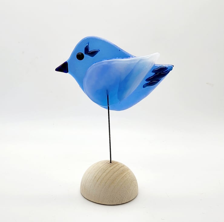 Beautiful handmade fused glass bird resting on a natural wooden half sphere. This unique piece is crafted by hand, with the bird shape cut out of decorative glass and adorned with intricate elements using frit. A one-of-a-kind addition to any home decor or collection.