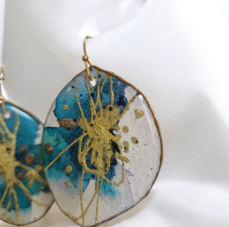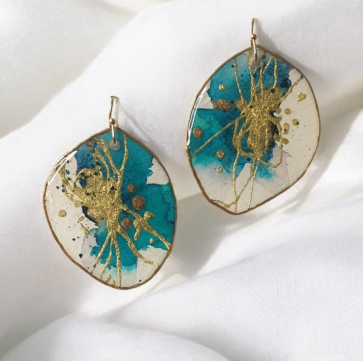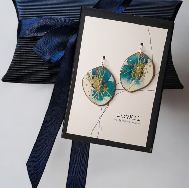 These beautiful large statement earrings are definitely made to impress. Unique mini watercolour paintings with inks, gold pigments and resin which gives them an almost 3D feeling. Extremely lightweight and elegant are ready to match any occasion.