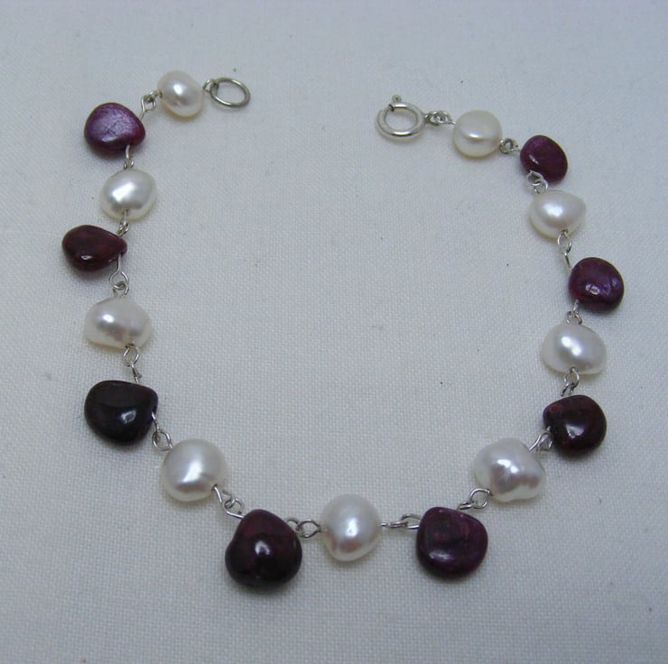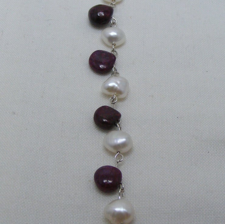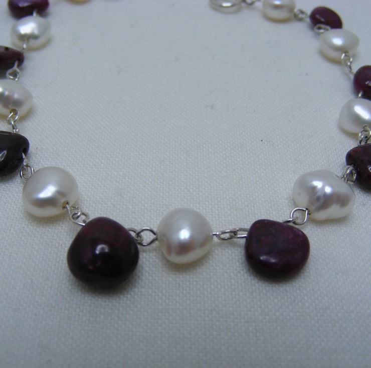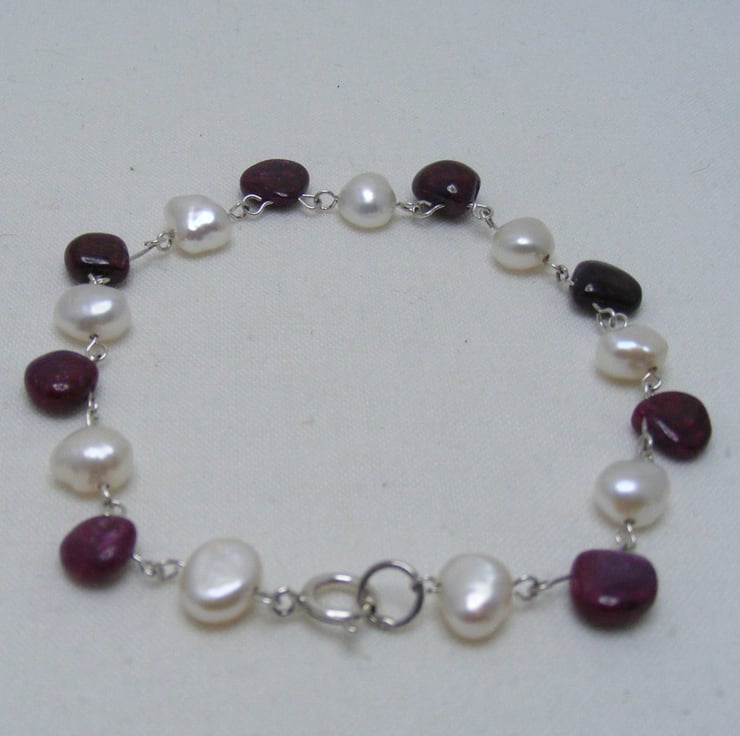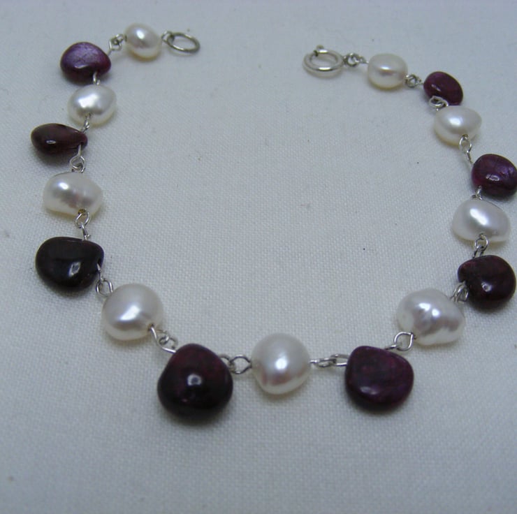 One of a kind bracelet, handmade with, 6x9mm white freshwater cultured baroque pearls, 5-9mm ruby heart gemstones and 925 sterling silver eye pins and bolt clasp.