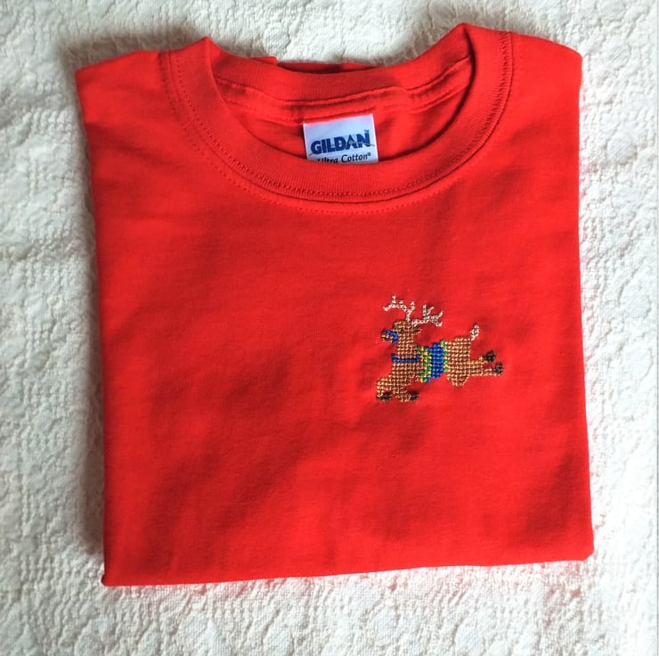 A reindeer is for life, not just for Christmas. I have hand embroidered a leaping reindeer on the left breast of this bright red T-shirt by Gildan. He wears a green, royal and golden yellow saddle and royal blue bridle. The shirt is 100% cotton and machine washable, though I advise a cool wash, because the shirt is such a vibrant red!