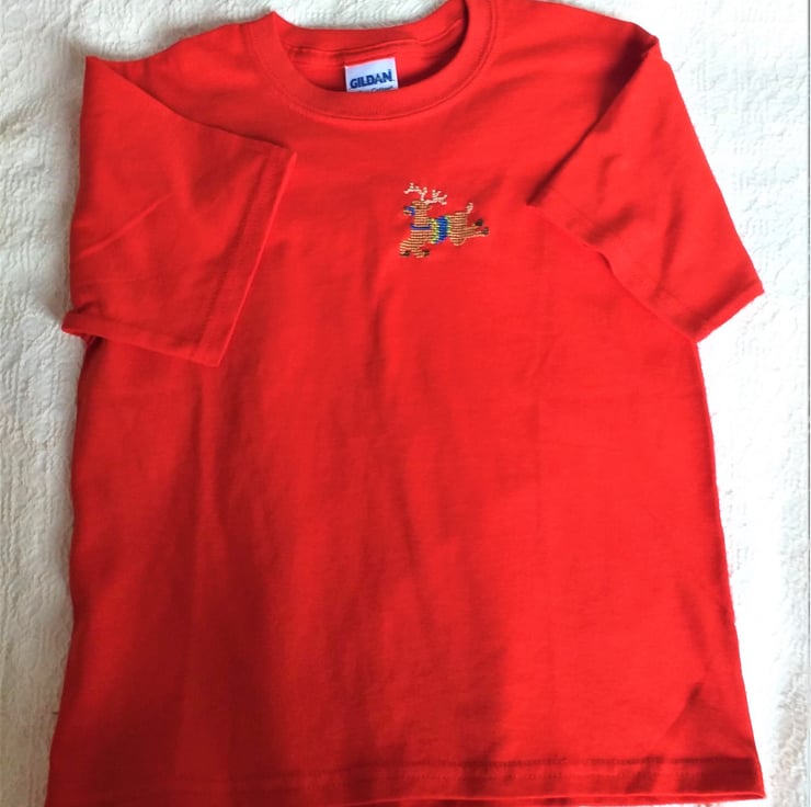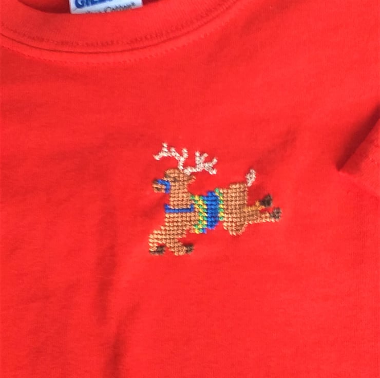 A reindeer is for life, not just for Christmas. I have hand embroidered a leaping reindeer on the left breast of this bright red T-shirt by Gildan. He wears a green, royal and golden yellow saddle and royal blue bridle. The shirt is 100% cotton and machine washable, though I advise a cool wash, because the shirt is such a vibrant red!