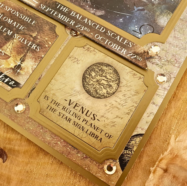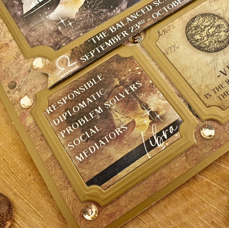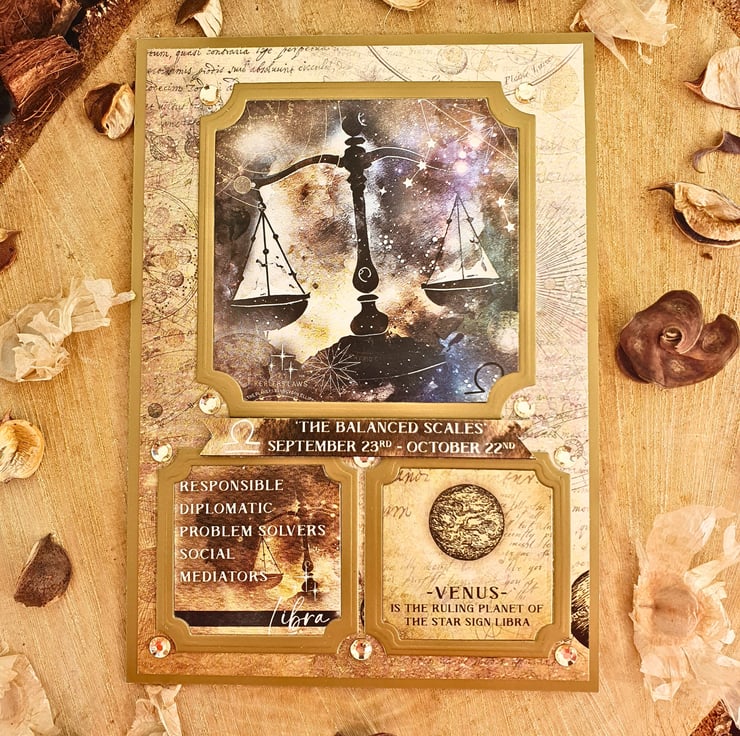 The card consists of mats & layers of gold pearlescent card & luxury paper printed an astrological pattern, decorated with Libra zodiac sign toppers. It displays the margin dates of the Libra birthdays & also some of the personality characteristics. It is embellished with gold diamante gemstones. Finished with two panels of coordinating inserts, blank, for you to add your own messages and wishes. Decorative photo corners give a unique finish to the card.