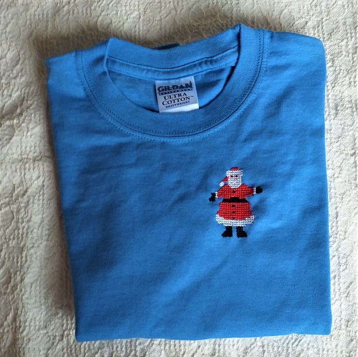 You're never too old for a Father Christmas T-shirt. This is a royal blue Gildan T-shirt age 6, (Youth XS) upon which I have hand-embroidered him. He wears his traditional red outfit trimmed with white fur, a black belt, boots and gloves. As I never use a permanent backing when embroidering kids' clothing, there is nothing inside the shirt to irritate your child's skin. The shirt is 100% cotton and machine washable.