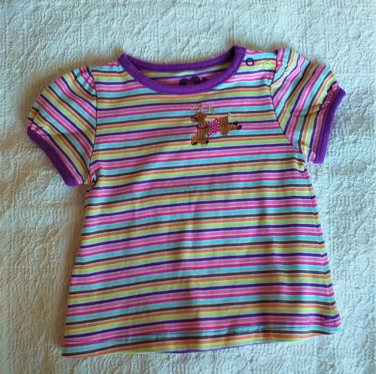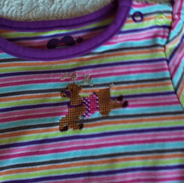 A reindeer is for life, not just for Christmas. I have hand embroidered a leaping reindeer on the front of this lovely soft little T-shirt for a baby girl - the perfect gift for her first Christmas. The T-shirt is striped, with narrow pale blue, white, light and dark pink, orange, brown, lime green and purple stripes. The deer wears a saddle and bridle in co-ordinating pink and purple colours.