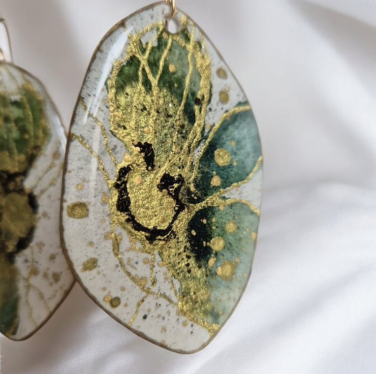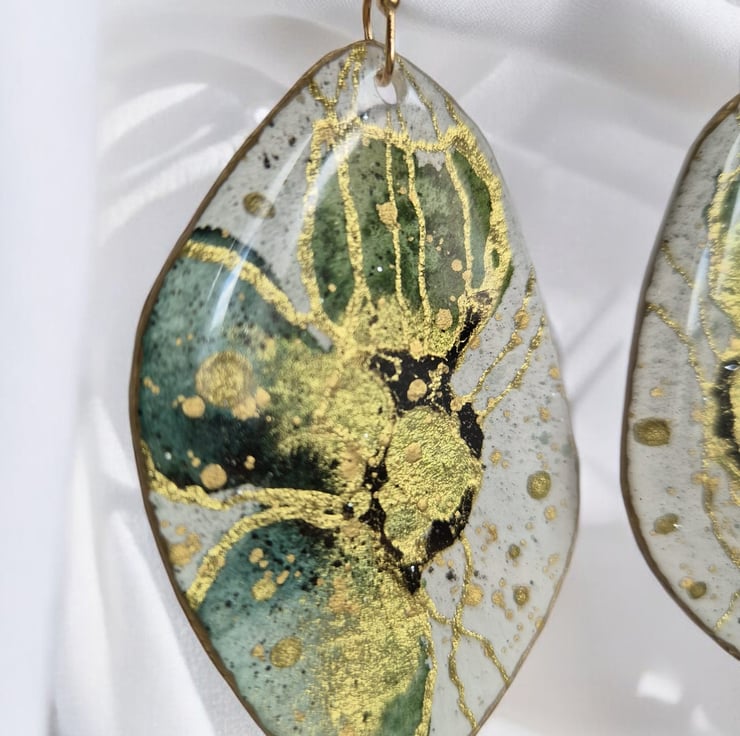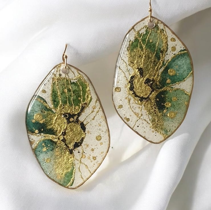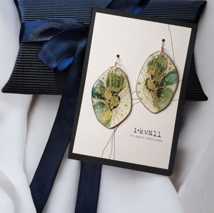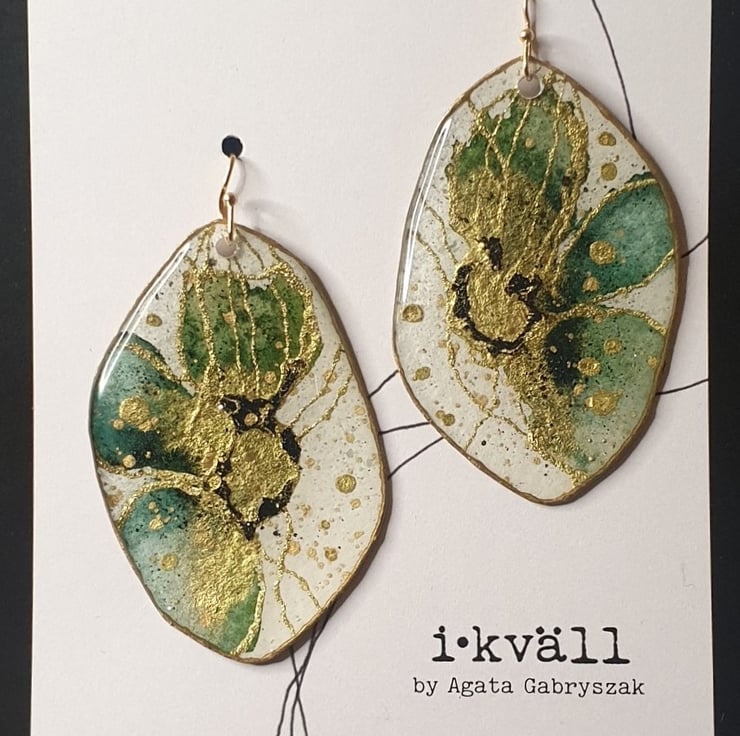 These beautiful large statement earrings are definitely made to impress. Unique mini watercolour paintings with inks, gold pigments and resin which gives them an almost 3D feeling. Extremely lightweight and elegant are ready to match any occasion.