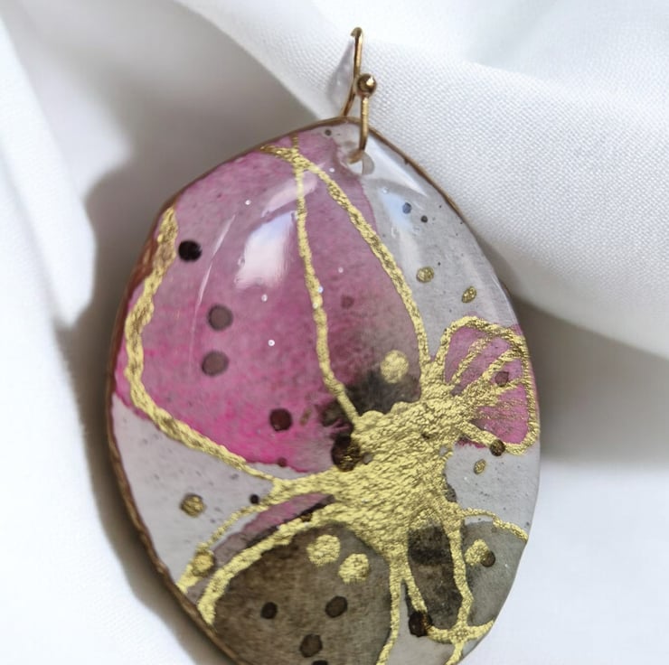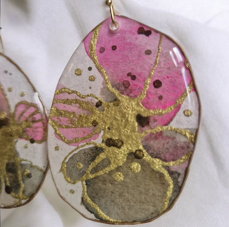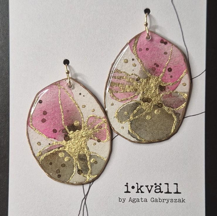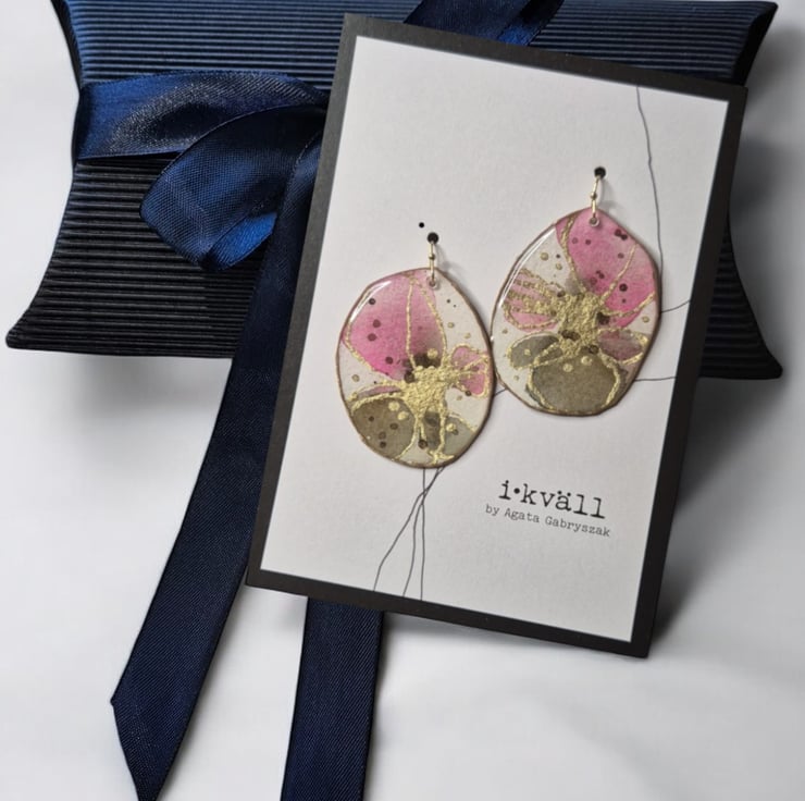 These beautiful large statement earrings are definitely made to impress. Unique mini watercolour paintings with inks, gold pigments and resin which gives them an almost 3D feeling. Extremely lightweight and elegant are ready to match any occasion.